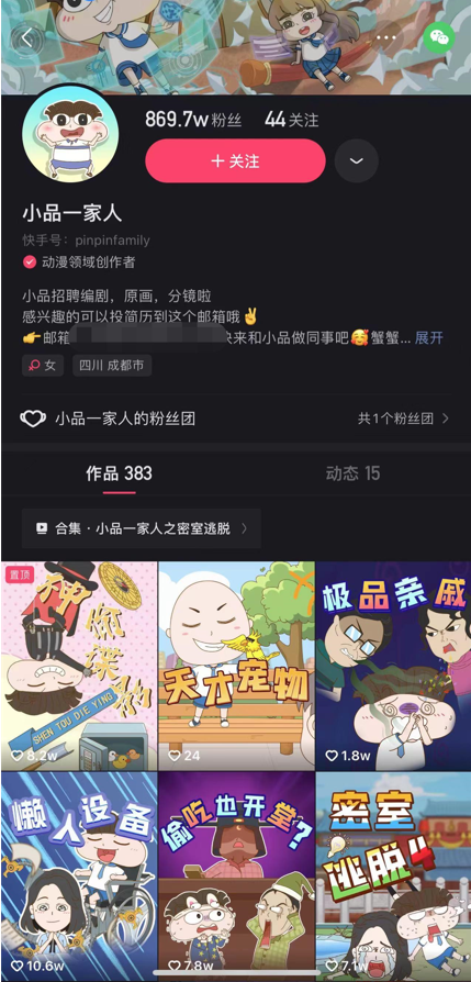 这是一家动画公司,旗下代表作品是《小品一家人》等系列短篇动画作品,在各类视频平台发布,小品一家人的快手号已经积累了869万粉丝,并且仍在快速增长着。