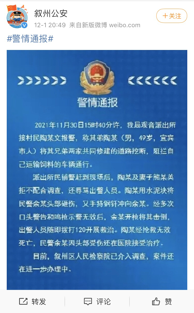 12月1日,四川省宜宾市公安局叙州区分局发布警情通报称,11月30日15时40分许,该局观音派出所接村民陶某文报警,称其弟陶某(男,49岁,宜宾市人)将其兄弟两家共同修建的道路挖断,阻拦自己运输饲料的车辆通行。