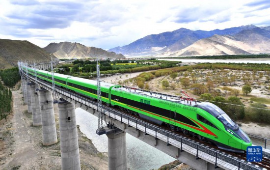 2021年6月25日,全长435公里、设计时速160公里的拉林铁路建成通车,西藏首条电气化铁路建成,同时复兴号实现对31个省区市全覆盖。这是试运行的复兴号列车行驶在西藏山南市境内(6月16日摄)。新华社记者 觉果 摄