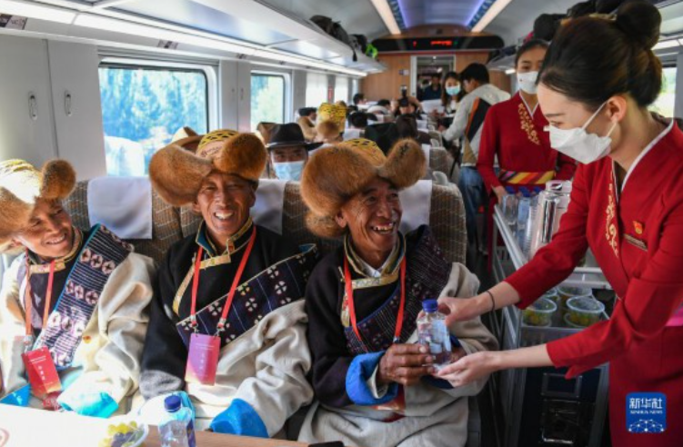 2021年6月25日,全长435公里、设计时速160公里的拉林铁路建成通车,西藏首条电气化铁路建成,同时复兴号实现对31个省区市全覆盖。这是6月25日列车员向乘坐首趟复兴号高原内电双源动车组的乘客递水。新华社记者 普布扎西 摄