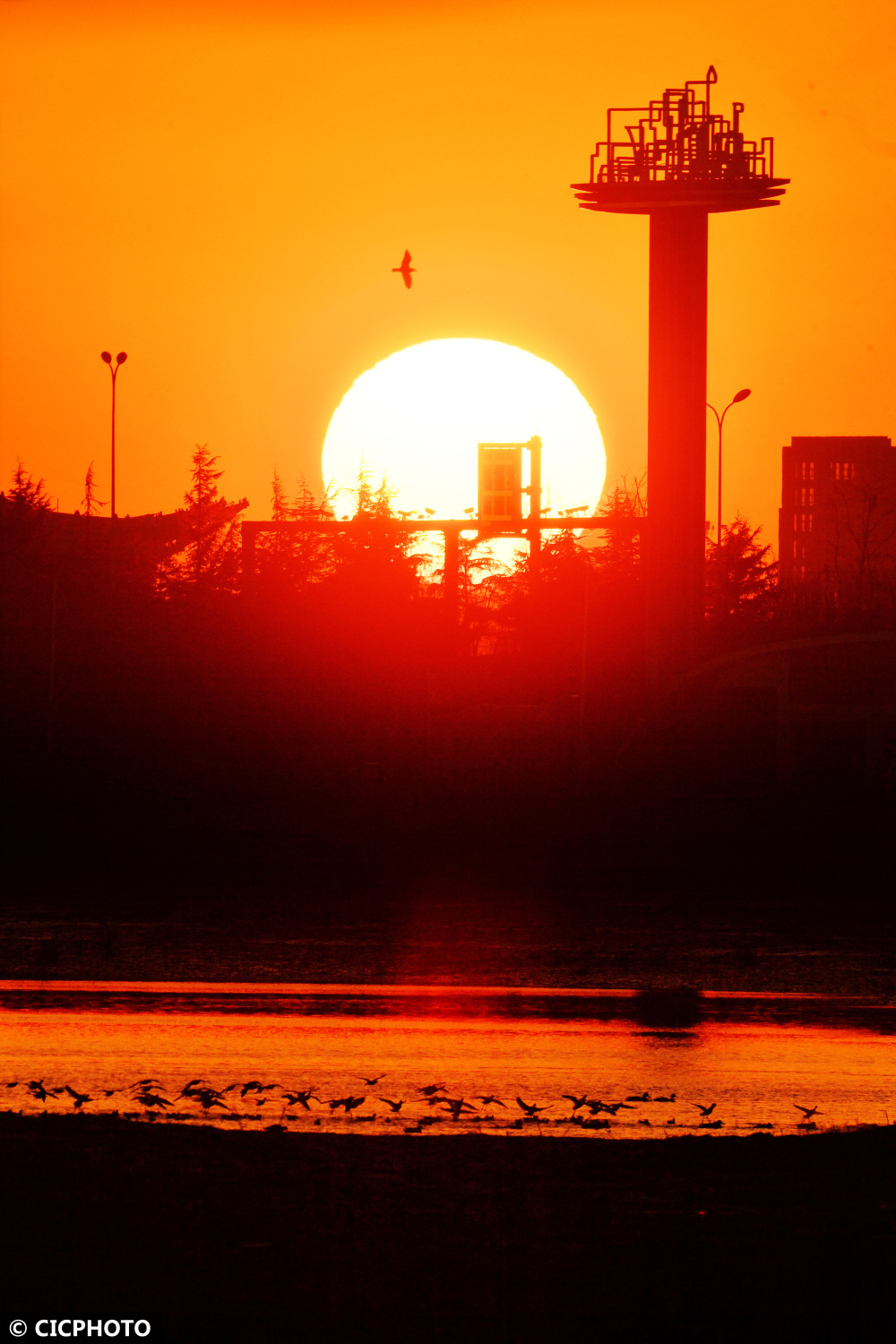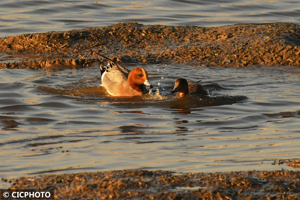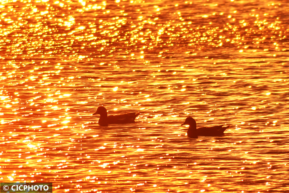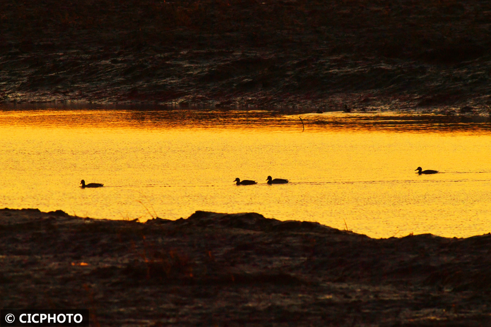 ↑2021年12月1日,在山东省青岛市城阳区流亭街道墨水河入海口湿地,成群野鸭在夕阳下觅食嬉戏。CICPHOTO/王海滨 摄