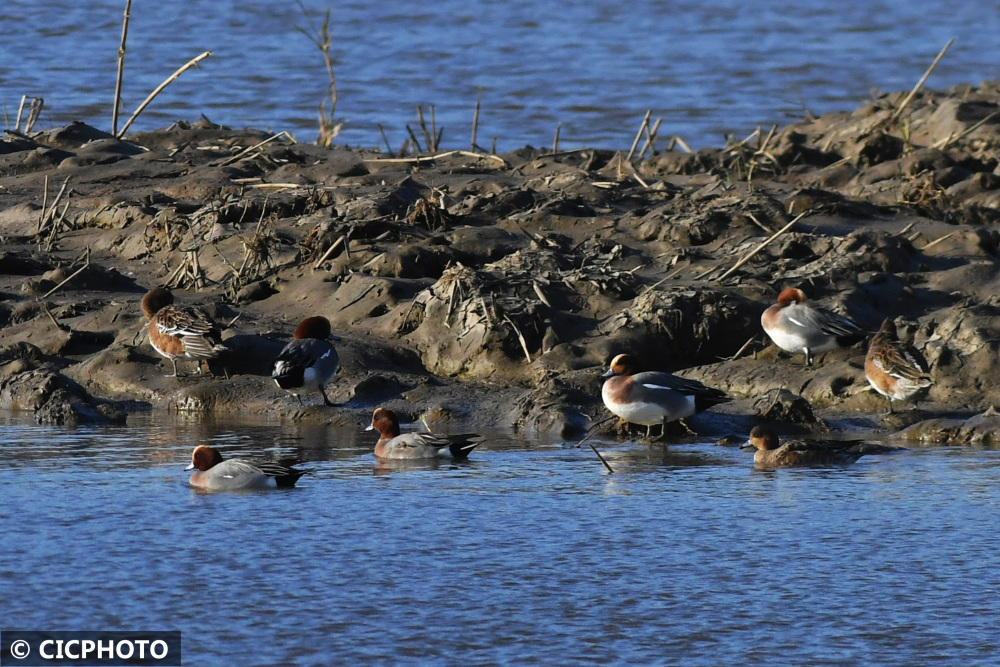 ↑2021年12月1日,在山东省青岛市城阳区流亭街道墨水河入海口湿地,赤颈鸭在水边结群栖息。CICPHOTO/王海滨 摄