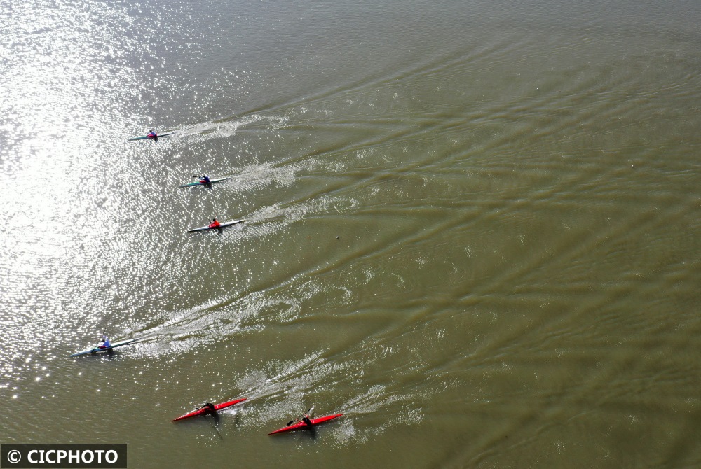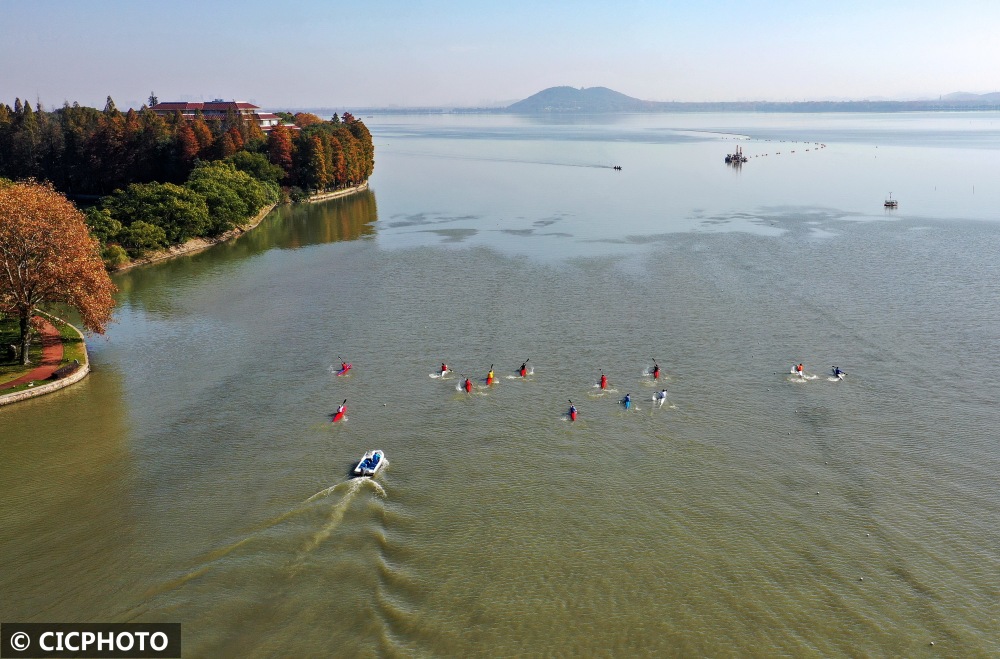 ↑2021年11月24日,湖北省武汉市水上运动学校学生在东湖进行皮划艇训练。(无人机照片)CICPHOTO/赵军 摄