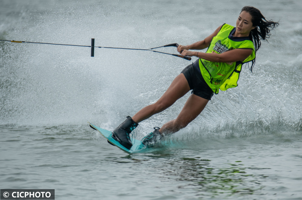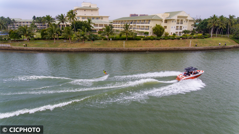 ↑2021年11月28日,在海南省琼海市博鳌镇举办的2021年全国滑水俱乐部巡回赛上,参赛选手在万泉河入海口水面上激烈角逐。CICPHOTO/蒙钟德 摄
