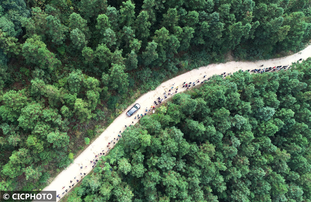 ↑2021年11月25日,湖南省娄底市双峰县三立学校学生走在印塘乡仙神寨村联通村组的公路上。当日,三立学校组织600余名学生开展徒步远足活动。(无人机照片)CICPHOTO/乃继辉 摄