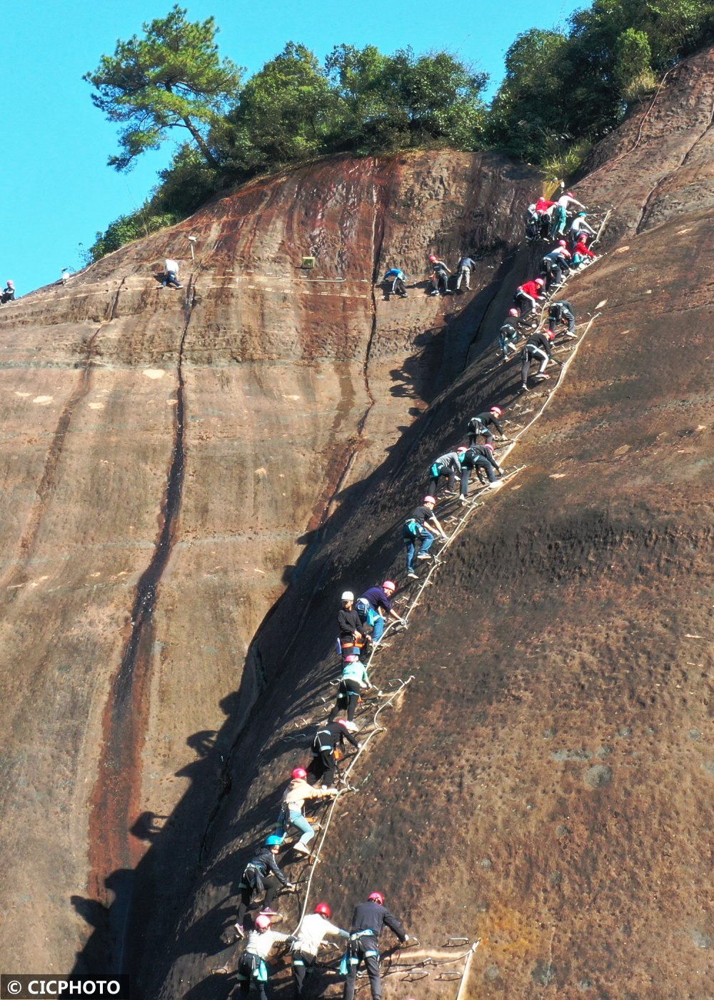 ↑2021年11月28日,游人在湖南省资兴市唐洞街道大王寨村一家户外基地体验飞拉达攀岩项目。CICPHOTO/黄春涛 摄