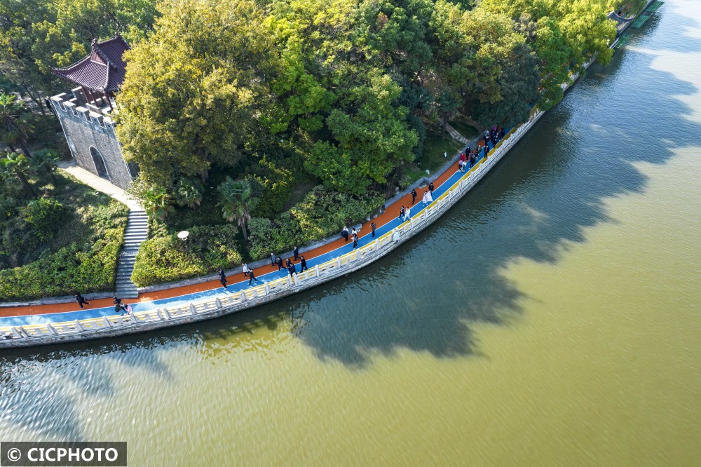 ↑2021年11月25日,江苏省泰州市市民在海陵区环城河健身步道上参加健走活动。(无人机照片)CICPHOTO/顾继红 摄