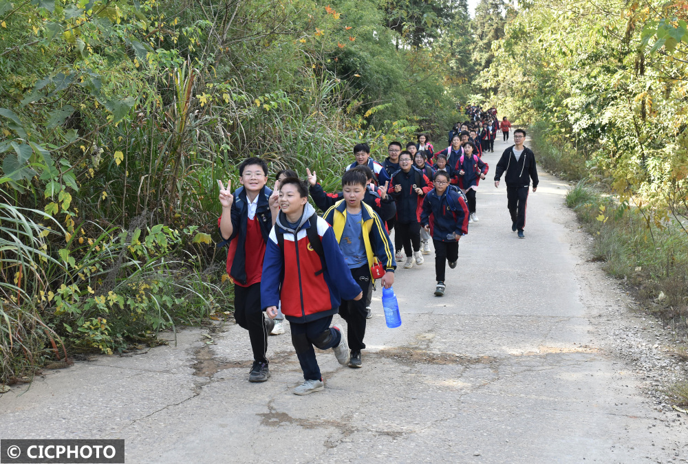 ↑2021年11月25日,湖南省娄底市双峰县三立学校学生走在印塘乡仙神寨村联通村组的公路上。当日,三立学校组织600余名学生开展徒步远足活动。CICPHOTO/乃继辉 摄