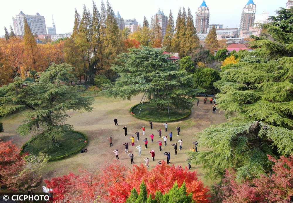↑2021年11月22日,江苏省南通市市民在南通博物苑晨练。(无人机照片)CICPHOTO/许丛军 摄