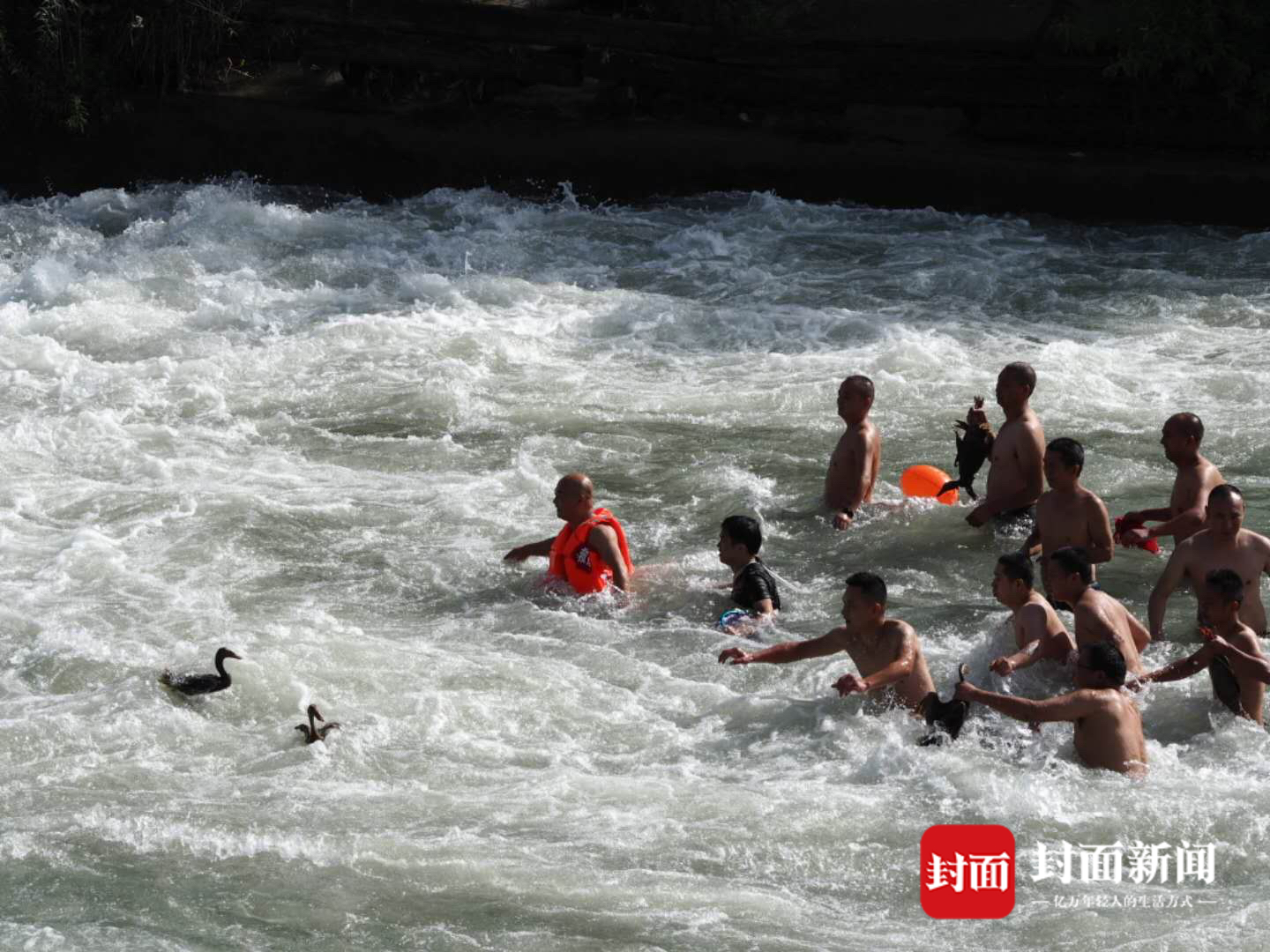 群鸭鼓翼狂奔,捕鸭人脚踩手划,沉浮浪尖,场面十分恢弘。这一形式新颖、接地气的活动,已成为三道堰传统龙舟会上一道亮丽的风景线。