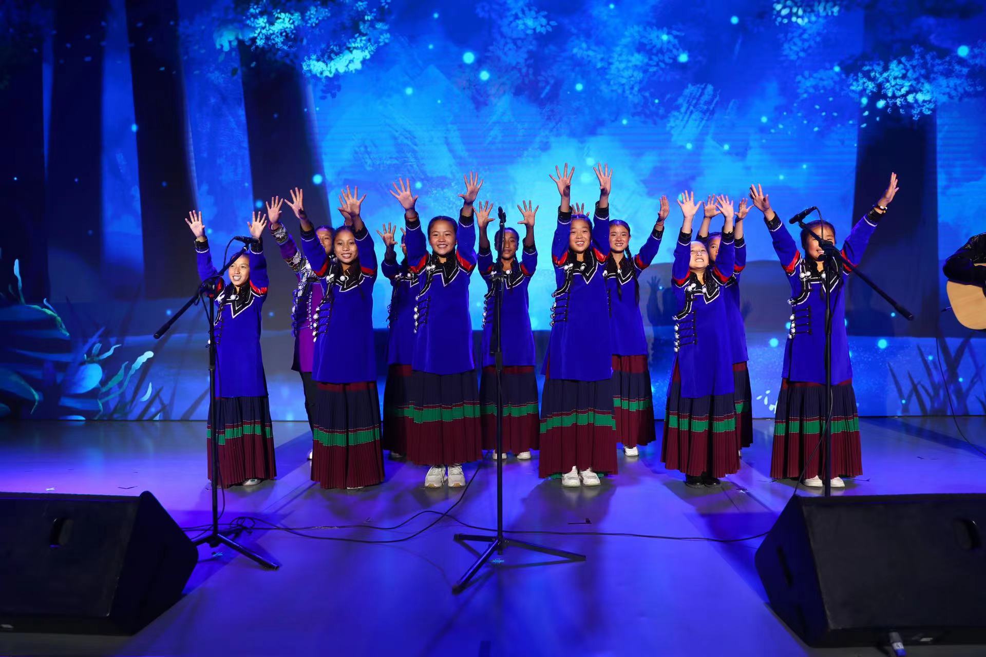 蓝布衣、彩条裙、麻花辫,眼睛里闪着星星,红扑扑的脸蛋漾开笑容……合唱团由一群彝族留守女童组成,“妞妞”是当地人对女儿的昵称。