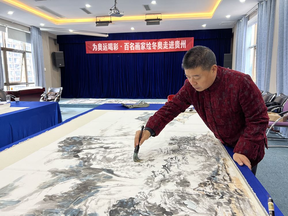 由“为奥运喝彩”组委会主办的文化活动“百名画家绘冬奥”在贵阳市乌当区天海美术馆于13日举行了第三站活动,贵州省美术家协会主席徐恒等8位画家应邀出席,并现场合作完成了两幅画作。
