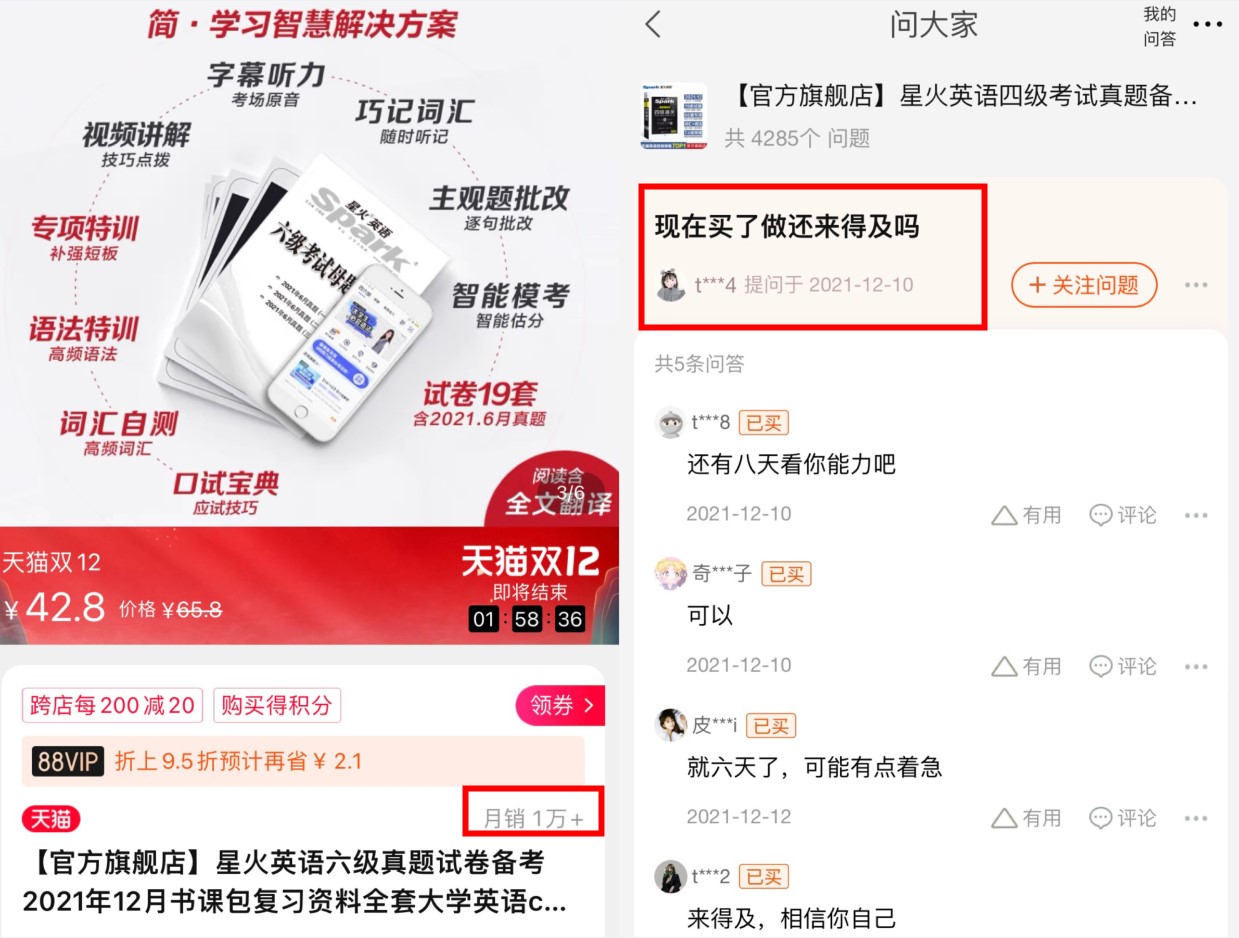 12月18日,2021年大学英语四、六级考试(CET)开考。双12成了本届考生最后的“佛脚”。记者发现,进入12月,还有人在淘宝店铺评论区问大家——“现在买还来得及吗”,光是星火英语的四级书课包(包含书和课程)就卖出了2万多套。