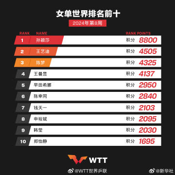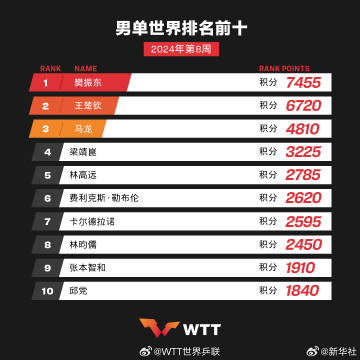 #孙颖莎樊振东领跑世界排名#【#国际乒联2024年第8周世界排名#】国际乒联2024年第8周世界排名公布。男子单打,中国队球员@樊振东 、@王楚钦___ 、马龙@captain龙 、梁靖崑、林高远@Eric-林高远 位列前五。女子单打,中国队球员@孙颖莎 、王艺迪@迪214 、@陈梦-乒乓球 、@王曼昱 位列前四,@陈幸同 位列第六,@钱天一321 位列第七。