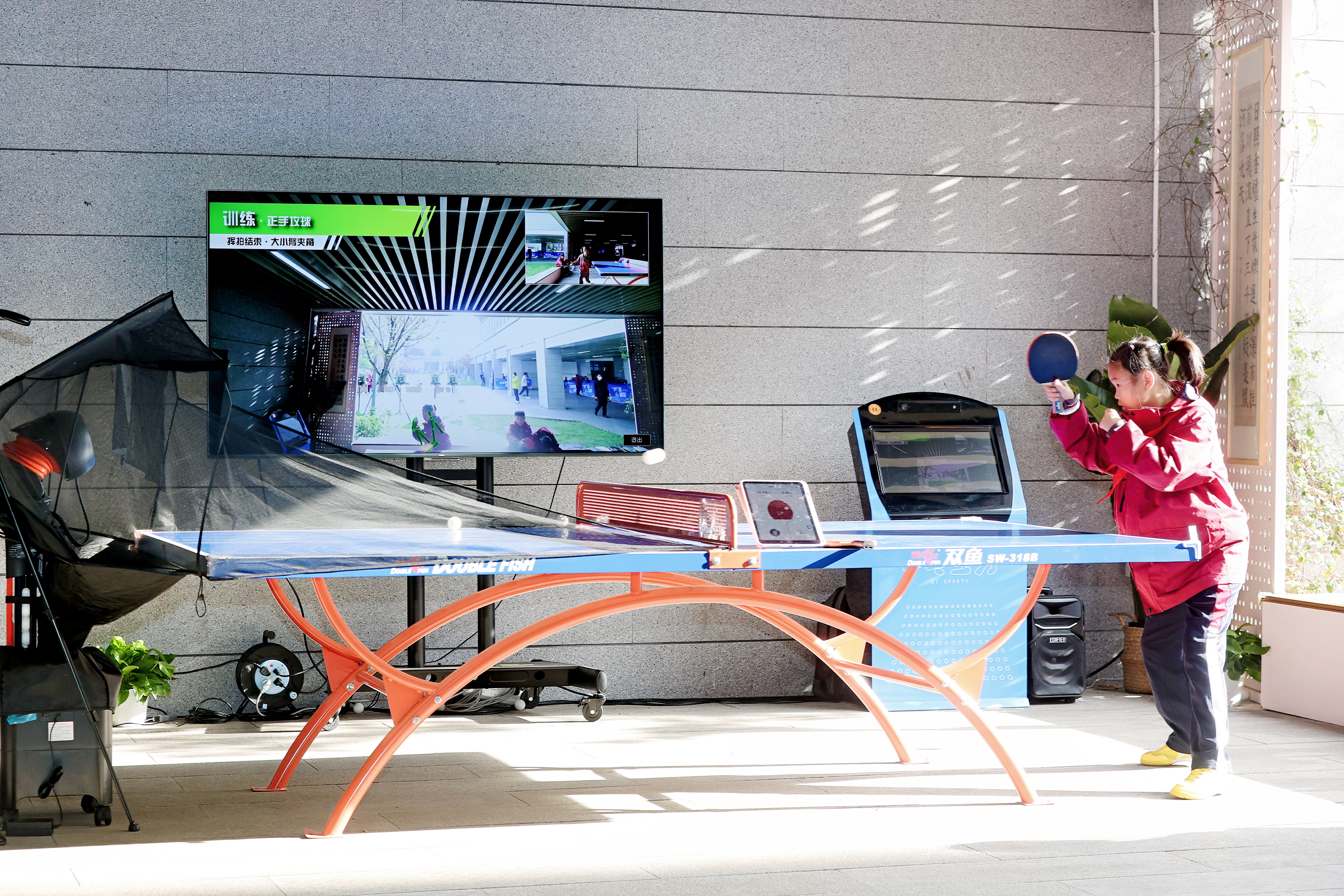 在校园内,记者看到不少智能乒乓球系统,学生与自动发球机对打,摄像头采集数据进行分析。