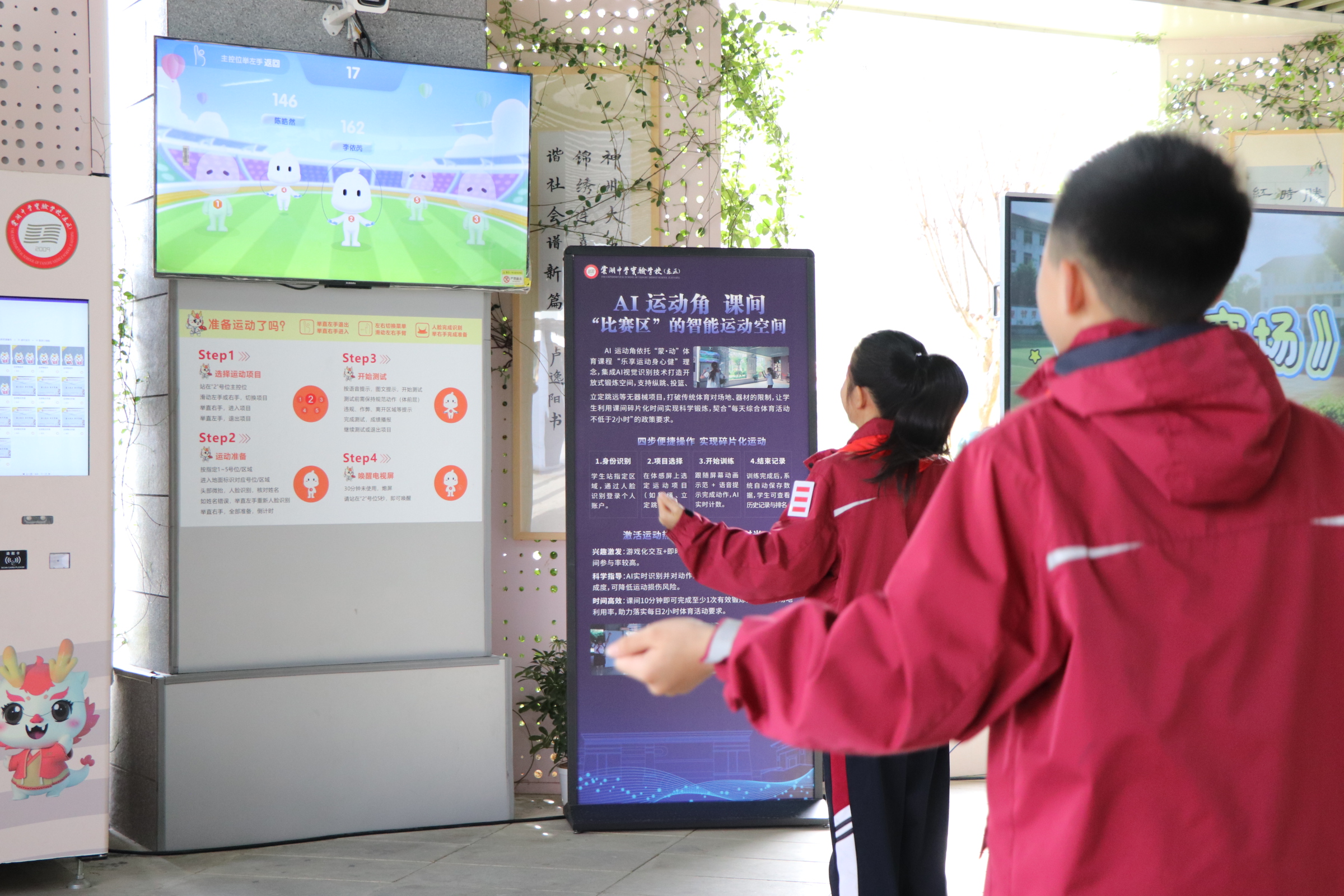学校还部署了7个AI运动屏。课间和放学后,孩子们刷脸就能进入自己的“AI分身”,立定跳远、开合跳、高抬腿……屏幕会记录成绩、生成排行榜。可以和自己比,也可以和同学PK。