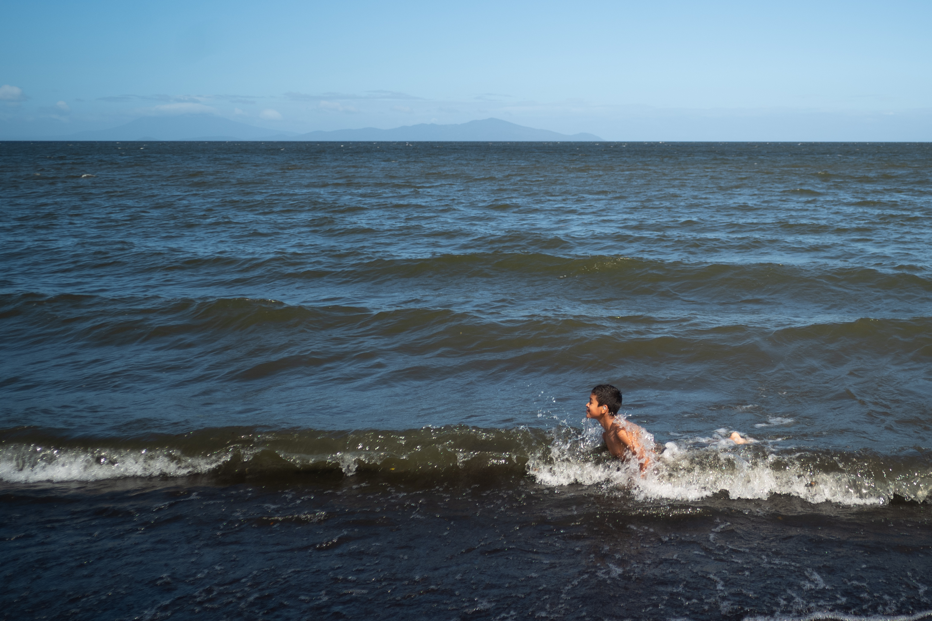 12月19日,在尼加拉瓜奥梅特佩岛,一名游客在尼加拉瓜湖里嬉戏。新华社记者辛悦卫摄