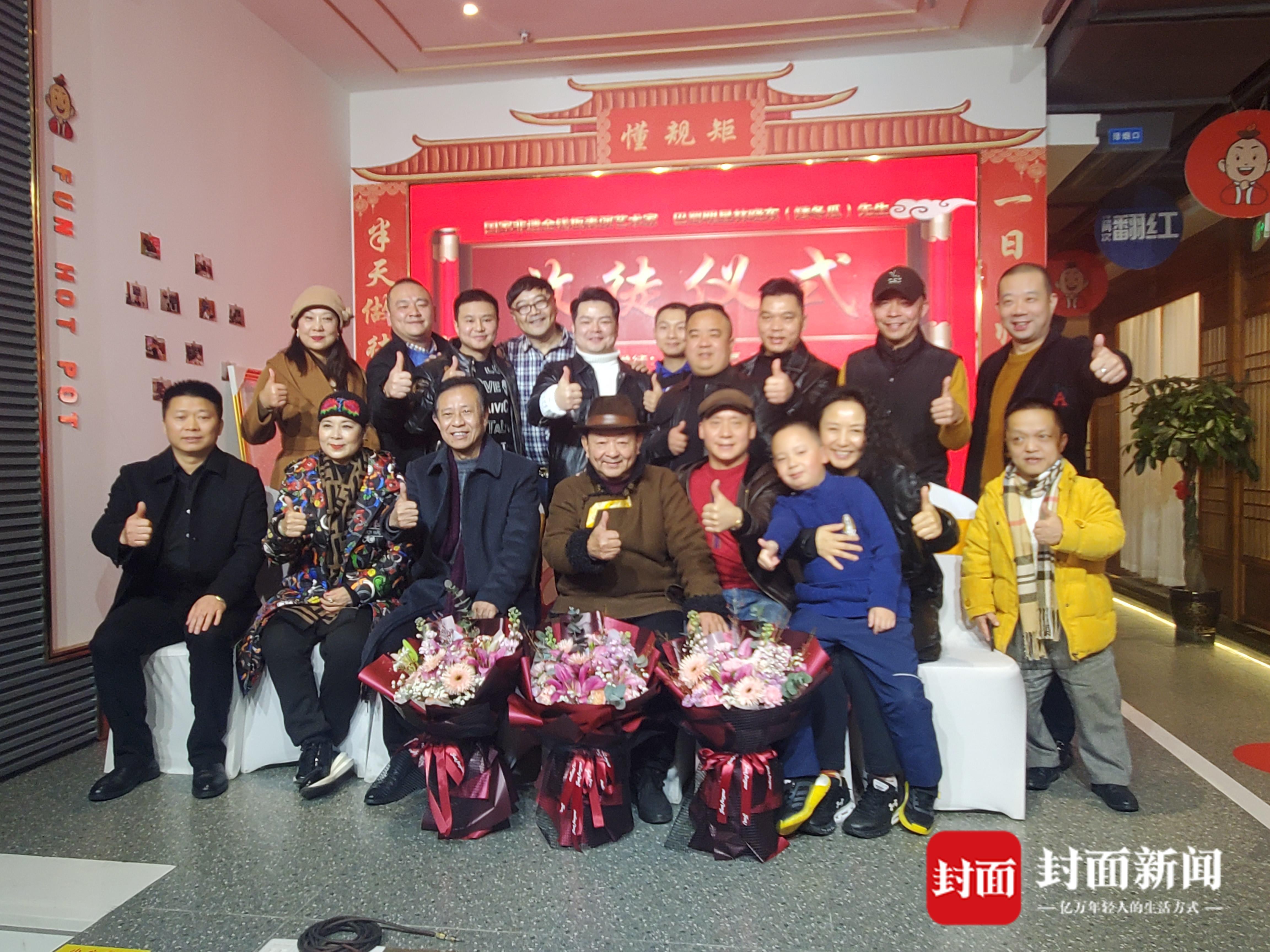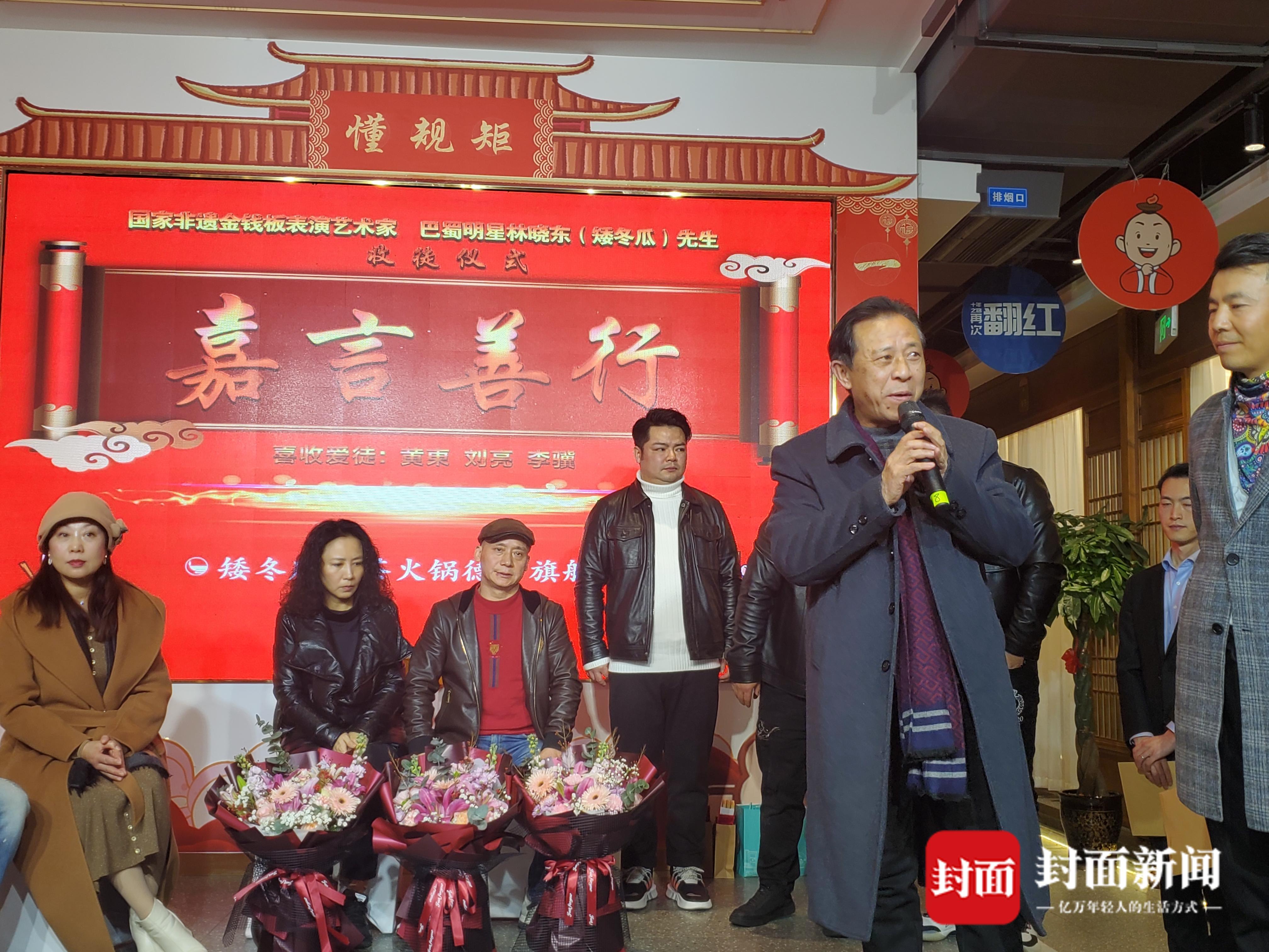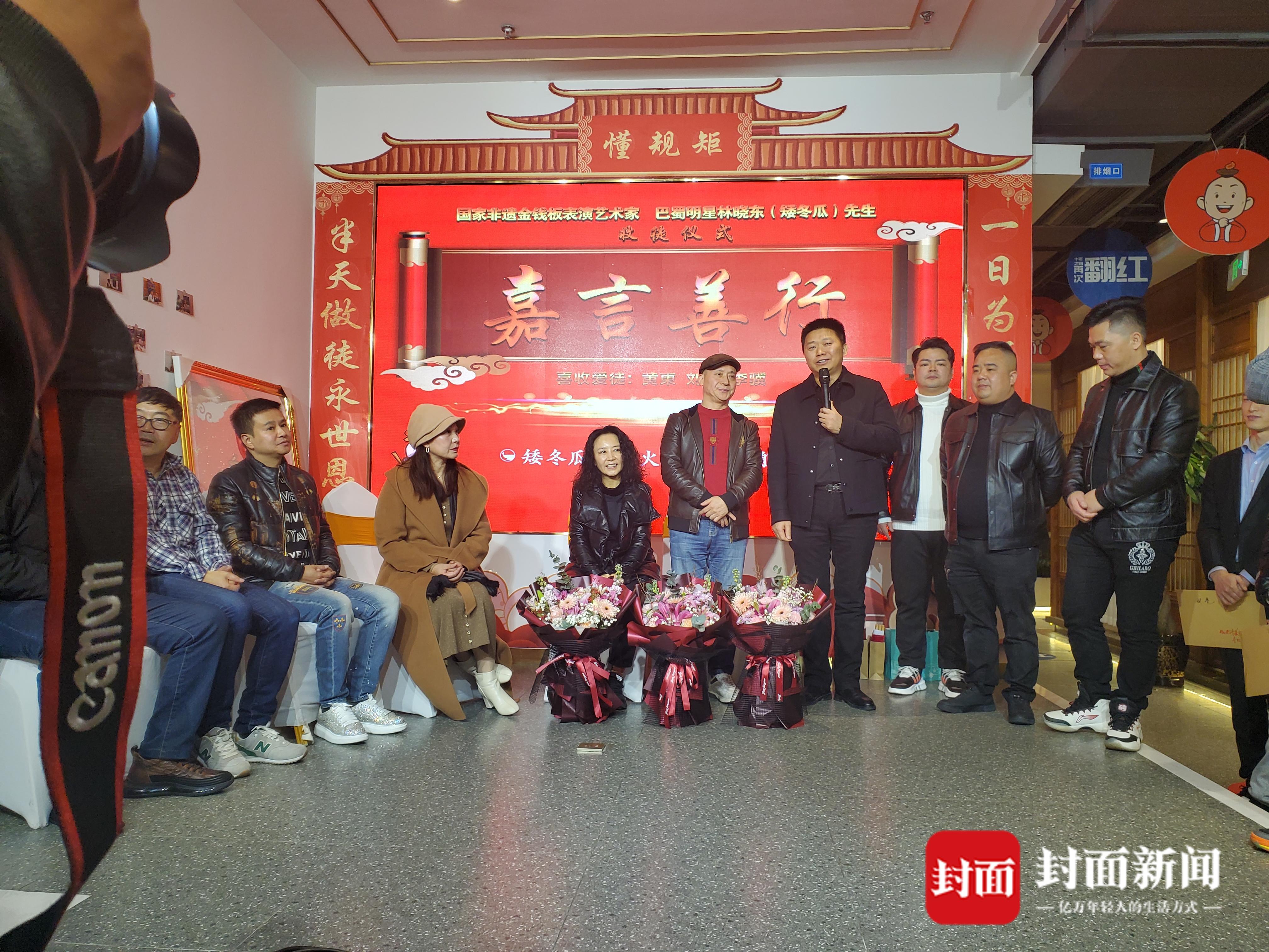 “今天,我作为华西都市报、封面新闻打造推广出来的巴蜀笑星,在我20多年的艺术人生中,是我第一次当师父,新收黄东、李骥、刘亮、漆正东等四个年轻人为徒弟,我向他们传授非遗传承文化四川金钱板艺术。我收徒弟目的很简单,就是把我们四川优秀文化一代代传承下去,为振兴四川曲艺繁荣做贡献!”