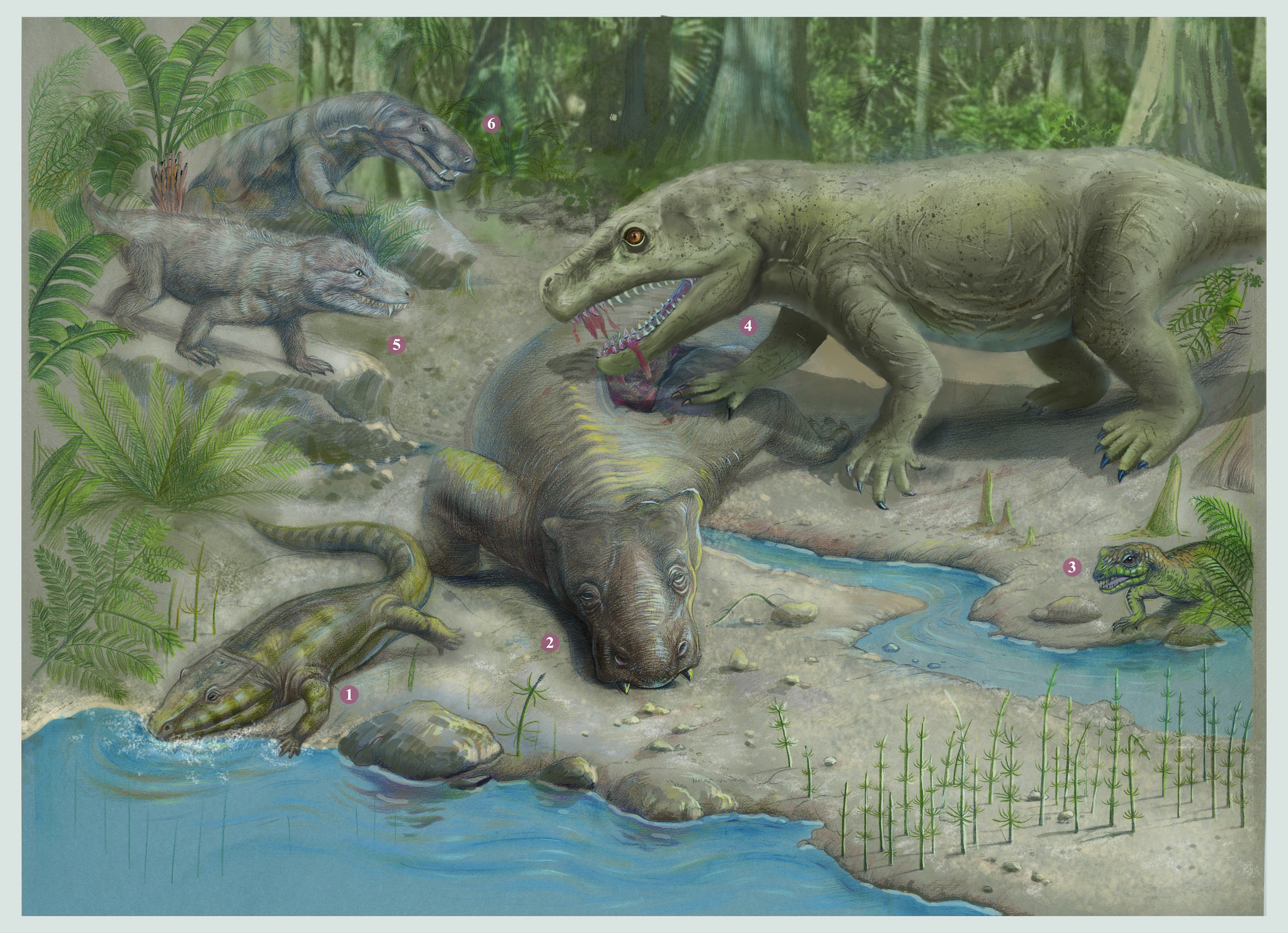 复原图:二叠纪的丽齿兽咬杀吞食大型植食兽足类,两者都在二叠纪末大灭绝中灭亡。绘制:郭肖聪