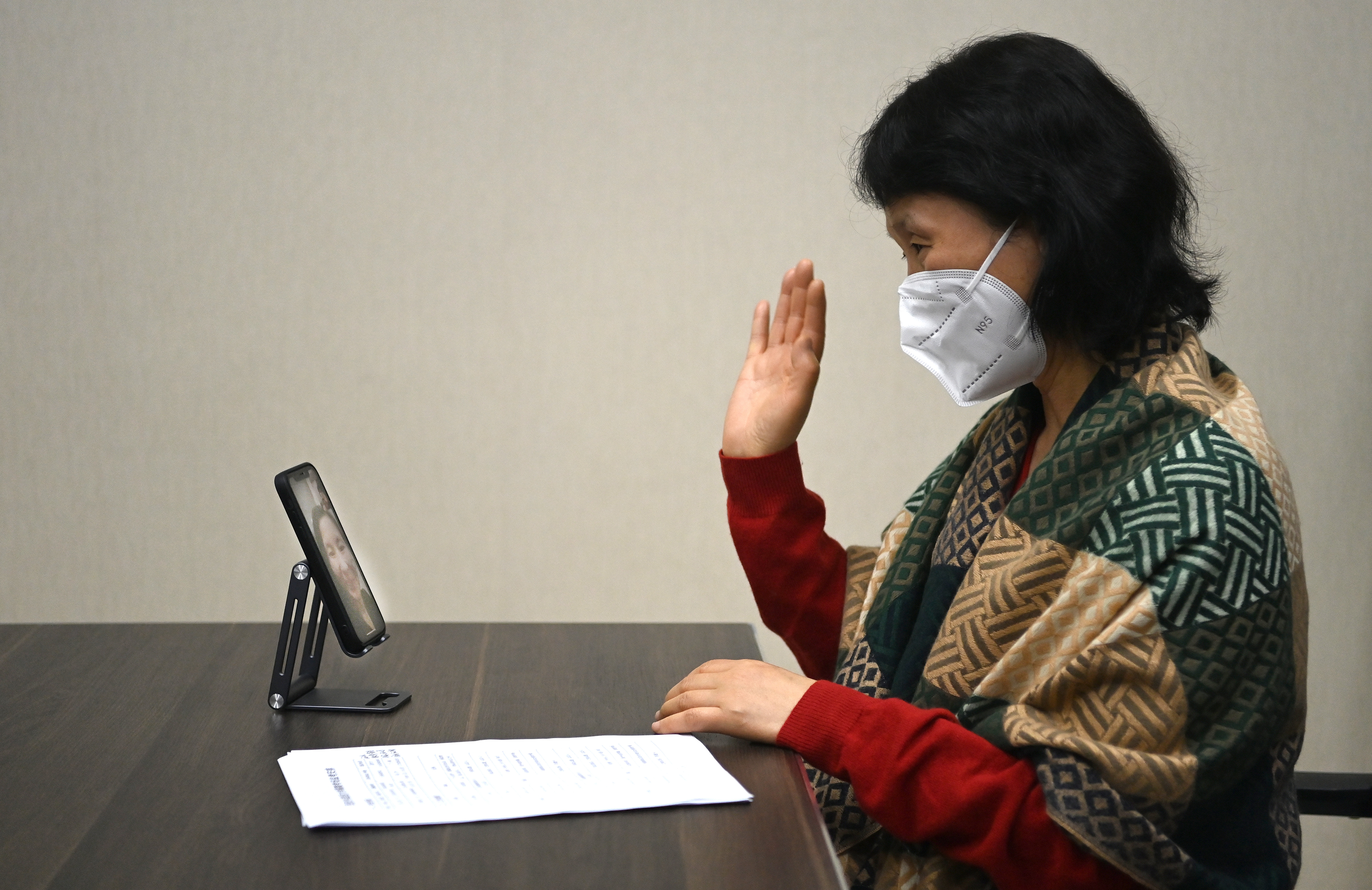 2021年12月24日,西安外国语大学副校长李雪茹与报考西外的隔离考点考生一一视频,送上慰问和祝福。(新华社记者 刘潇 摄)
