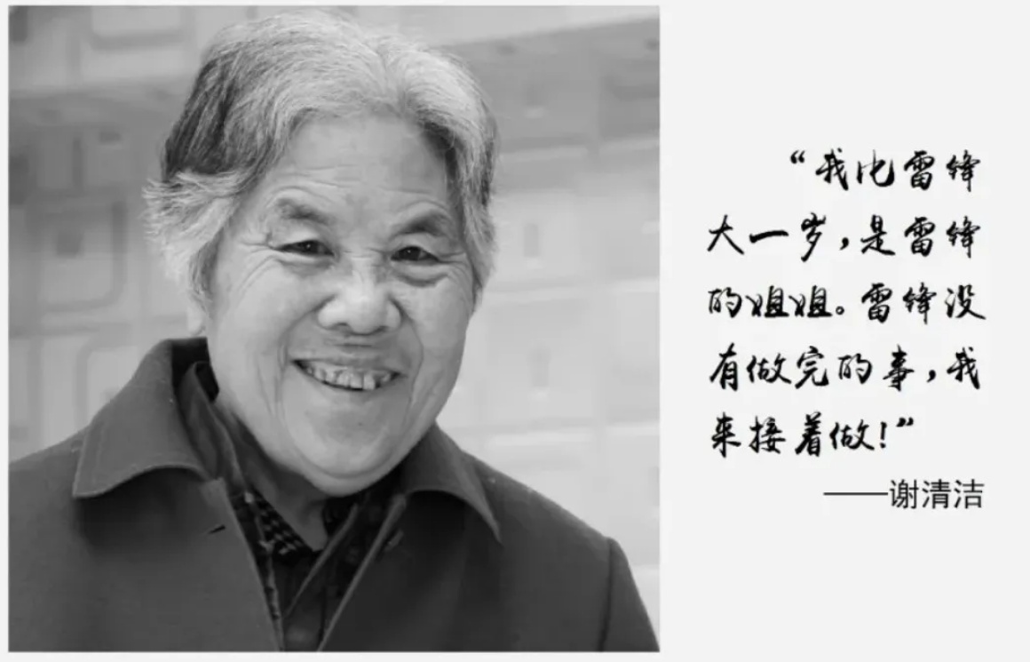 谢清洁,1939年出生在重庆。青年时代,她读了《雷锋日记》,被深深感动:“我比雷锋大一岁,是雷锋的姐姐。雷锋没有做完的事,我来接着做!”