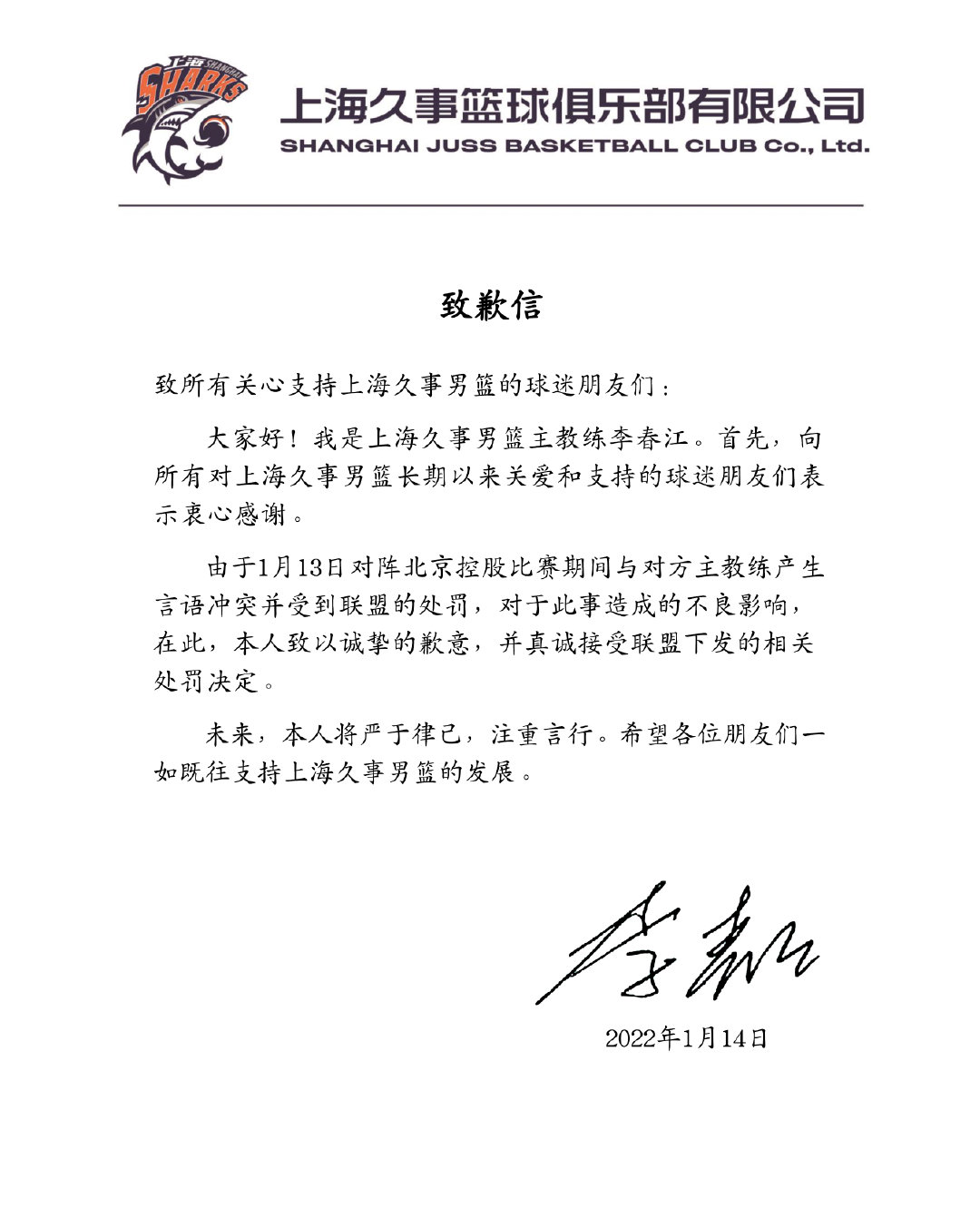 李春江通过上海男篮的官方社交媒体发布致歉信。