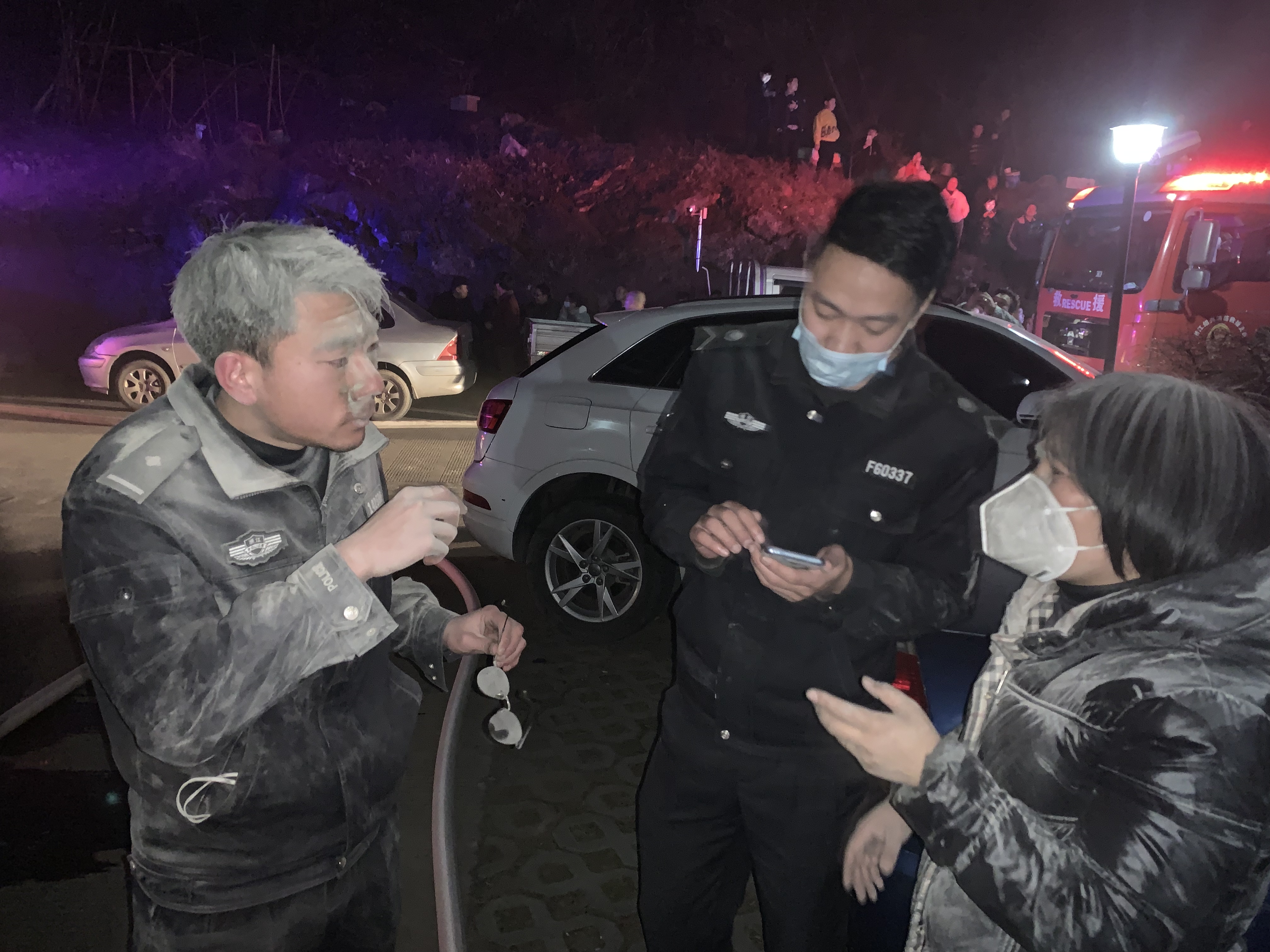 图为民警梁天雄(左一)用15支灭火器灭火后,头发和衣服上沾满干粉。(新昌县公安局供图)