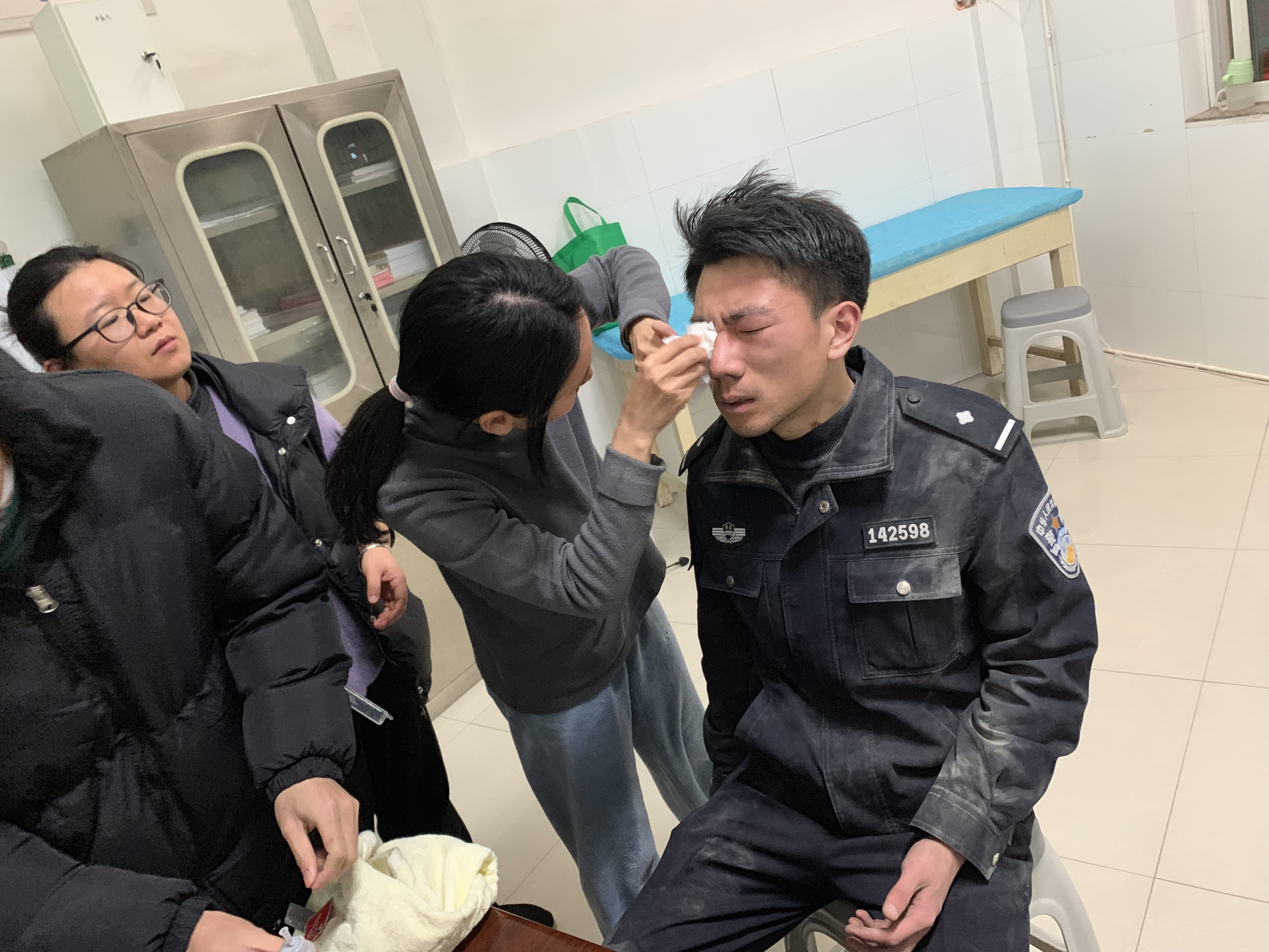 图为民警梁天雄灭火后到乡镇卫生院进行治疗。(新昌县公安局供图)