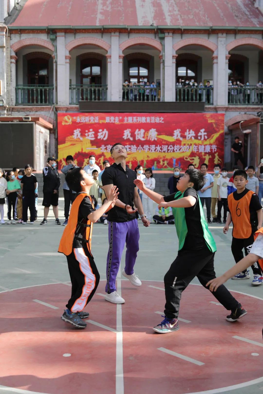 王春伟(中)为学校篮球联赛开球