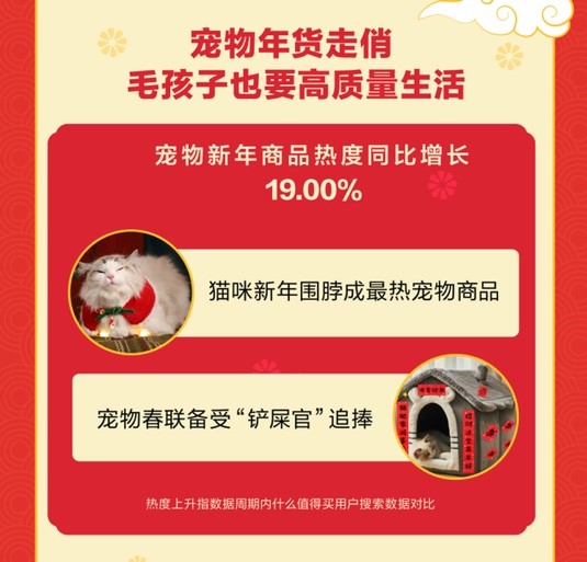 此外,宠物经济的崛起带动了宠物年货的火热,市场上宠物拟人化需求增长快速。“铲屎官”们纷纷为宠物购置年货礼盒、宠物年夜饭,让宠物们一起分享春节的喜悦。什么值得买数据显示,近期宠物商品GMV同比增长19%,猫咪新年围脖成最热门配饰,宠物春联也备受“铲屎官”追捧。
