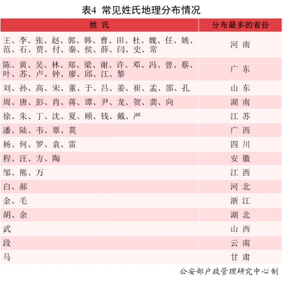 公安部1月24日第四次发布全国姓名报告,采用大数据技术,对全国新生儿姓名用字情况、常见姓氏、常见人名及地理分布等情况进行了统计分析。