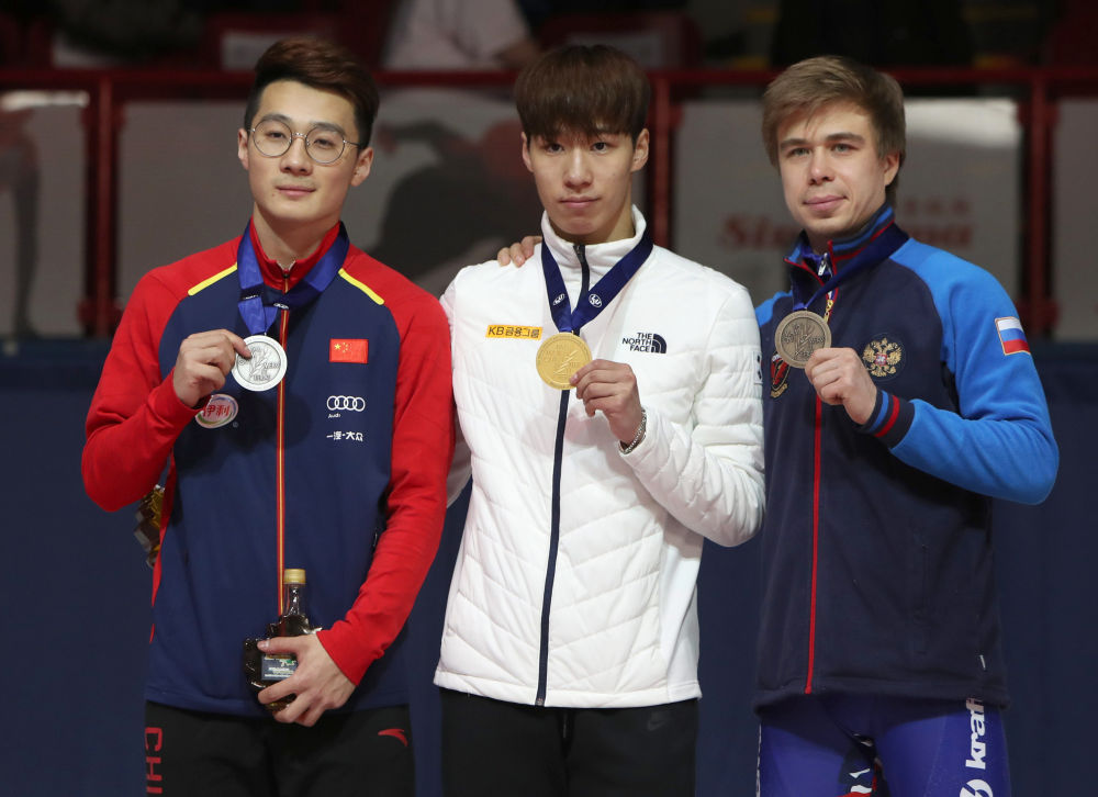 2018年3月17日,亚军中国选手任子威、冠军韩国选手黄大宪和季军俄罗斯选手埃里斯特拉托夫(从左至右)在加拿大蒙特利尔2018年短道速滑世锦赛男子500米决赛颁奖仪式上。新华社/路透