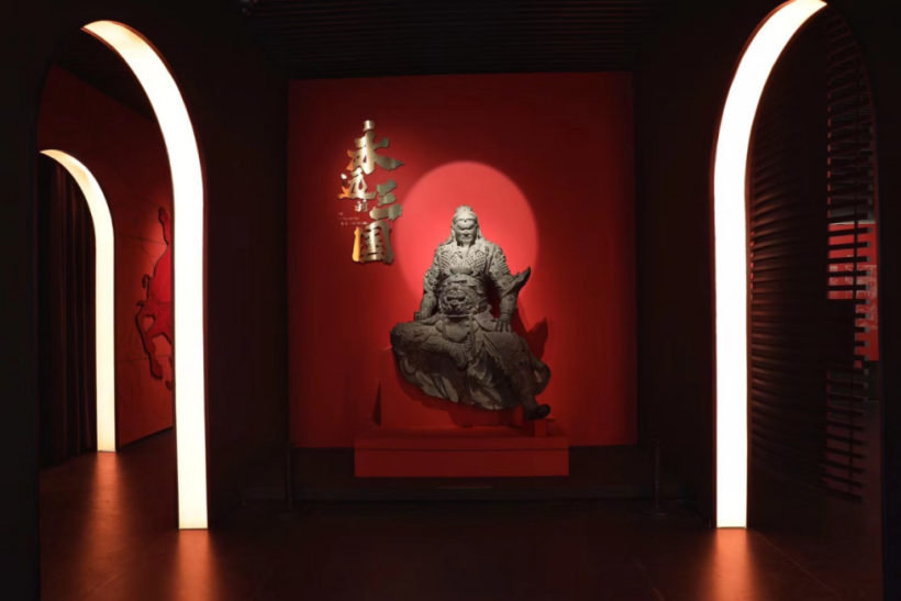 上篇室外统一用主题墙和幕帘整合营造展览氛围,幕帘采用原创手绘烫金三国英雄人物的纱幔,也契合上篇“英雄的时代”这一主题。下篇序厅,红墙上一轮圆形光晕衬底,神圣威严的关羽铜像端坐中央,搭配墙面左侧金属立体字“永远的三国”,极有张力的展示场景,给观众带来强烈的视觉冲击与情感共振。上篇展厅设计呈现传统古典的恢弘风格,下篇展厅设计展现当代活泼的艺术品位,古今联动,试图打造可看、可听、可触的具有仪式感的展览殿堂。