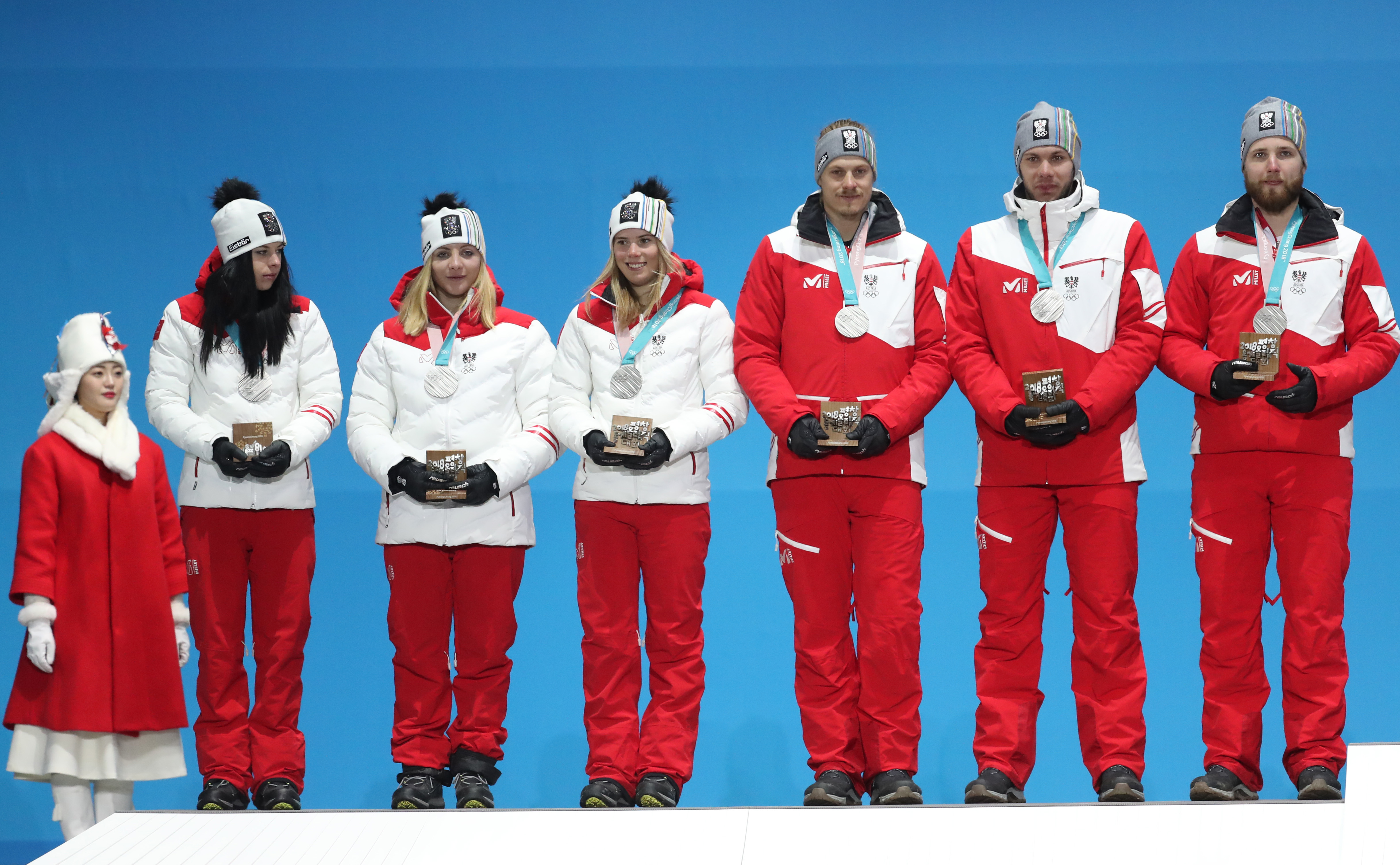 2018年2月24日,平昌冬奥会高山滑雪团体决赛奖牌颁发仪式在奖牌广场举行,亚军奥地利队在颁奖仪式上。新华社记者李钢摄