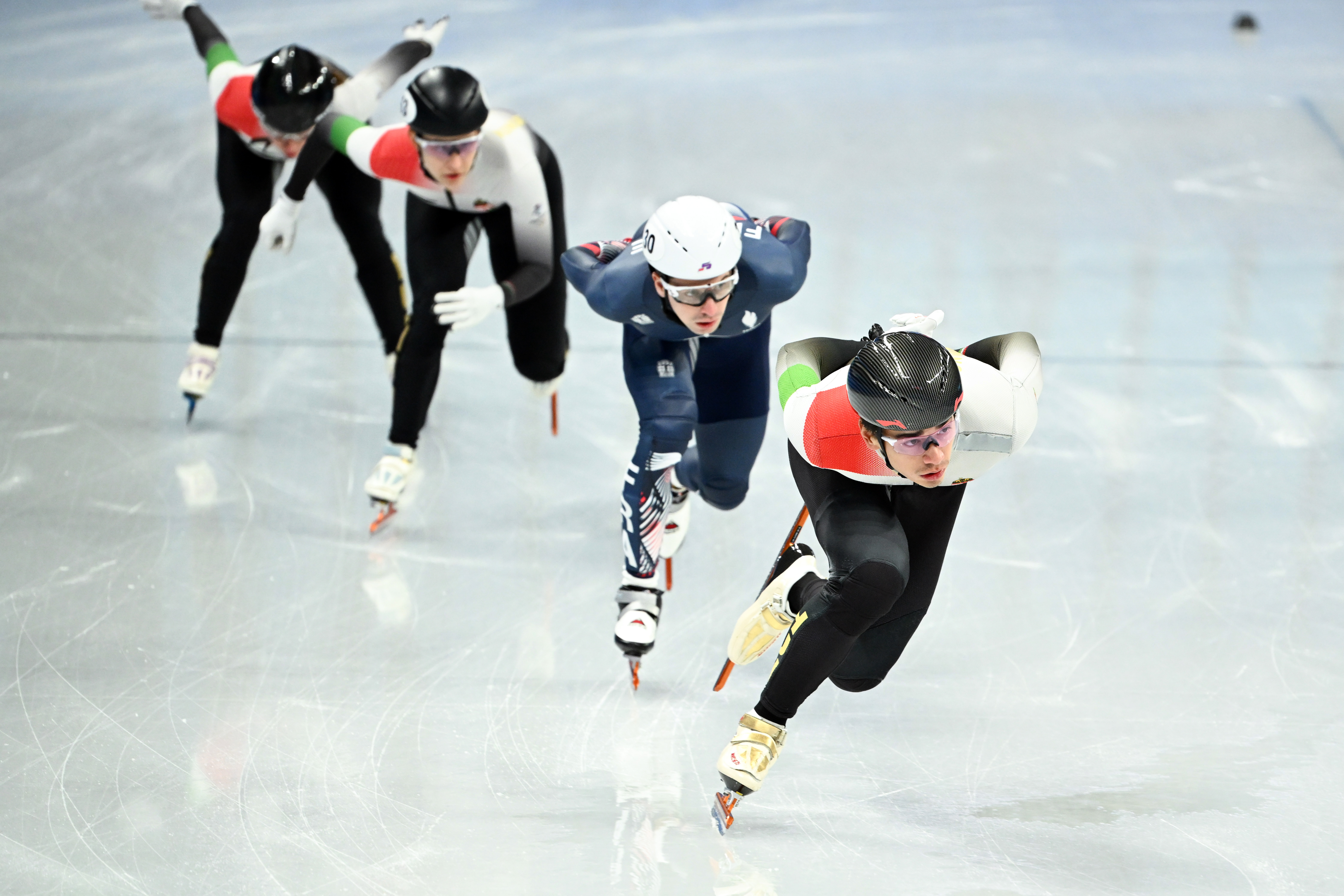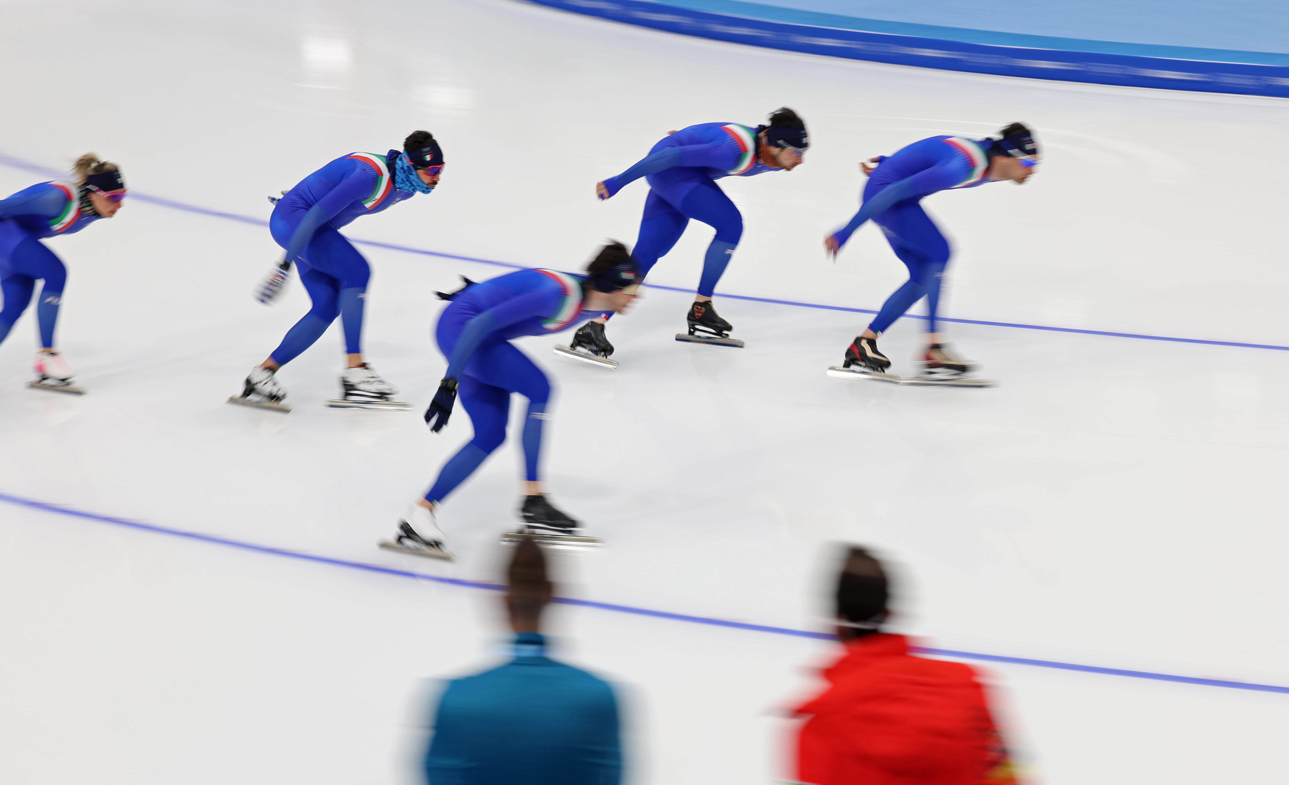 1月28日,意大利速度滑冰运动员在场馆内训练。新华社记者程婷婷摄