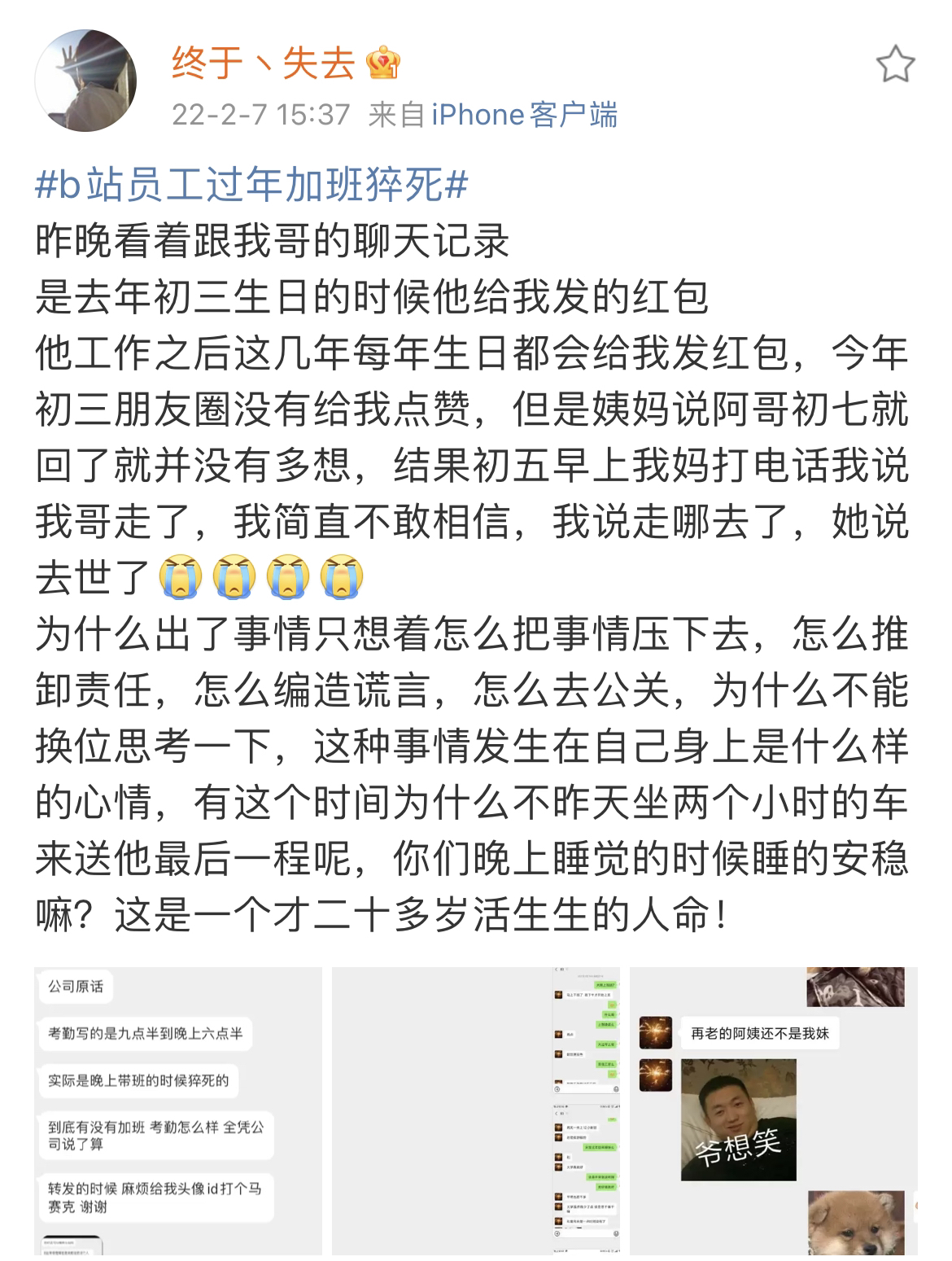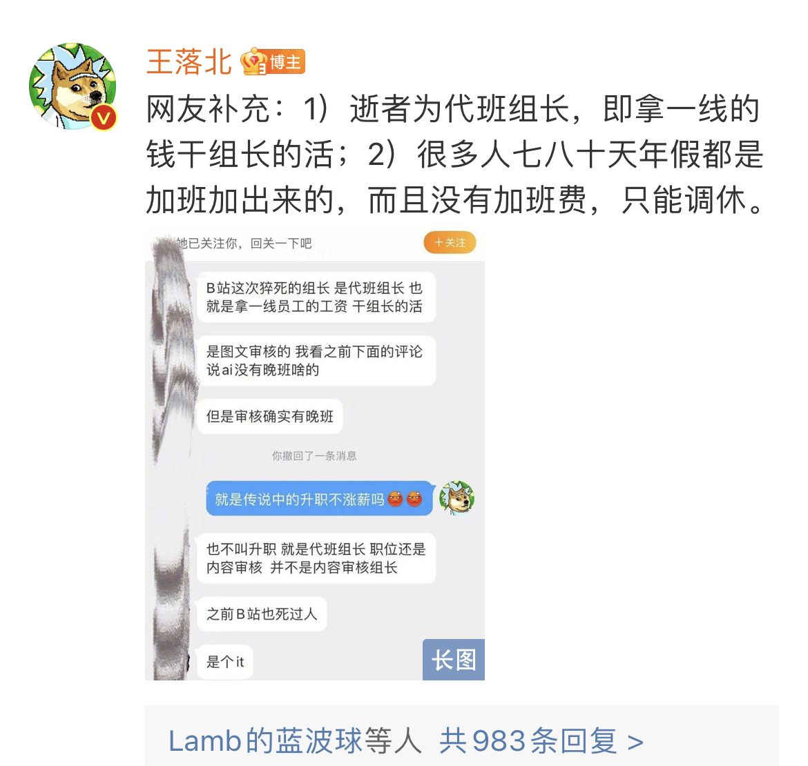 2月8日,一则#b站员工加班猝死#的词条冲上微博热搜。封面新闻记者注意到,一位名叫@王落北的发帖人称:据多名网友爆料,B站武汉ai审核组组长,因过年期间被要求加班,在晚上9点到早上9点的工作强度下,初五凌晨脑出血猝死......现在企业微信上已查无此人。