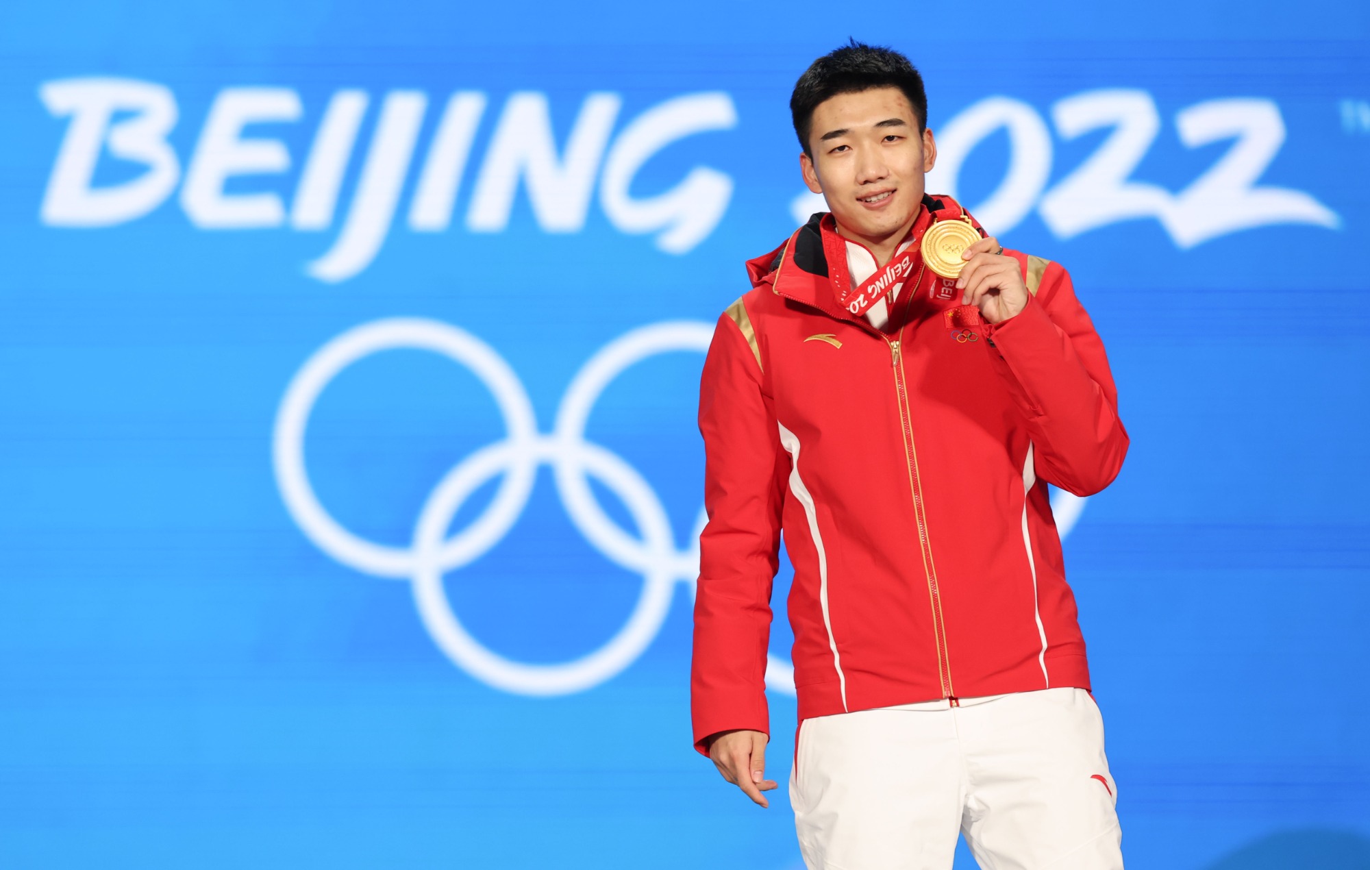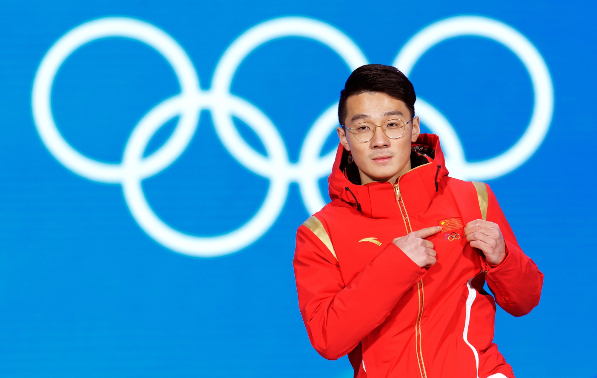 2月8日,冠军中国队选手任子威在北京2022年冬奥会短道速滑男子1000米奖牌颁发仪式上。新华社记者 鞠焕宗 摄