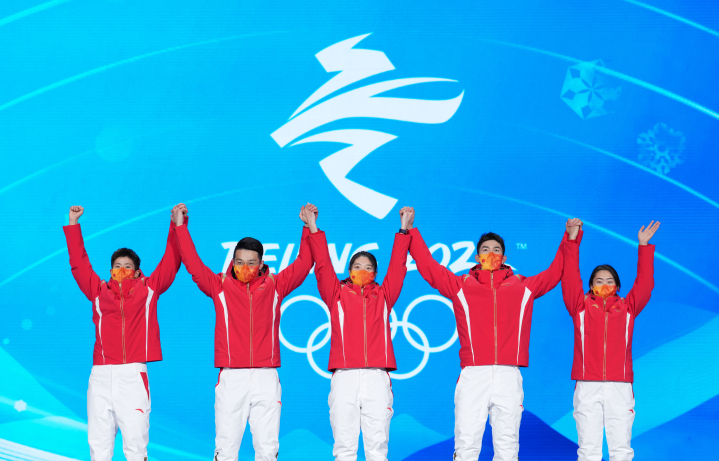 2月6日,中国队选手范可新、任子威、曲春雨、武大靖、张雨婷(从左至右)在北京2022年冬奥会短道速滑混合团体接力奖牌颁发仪式上。新华社记者 鞠焕宗 摄