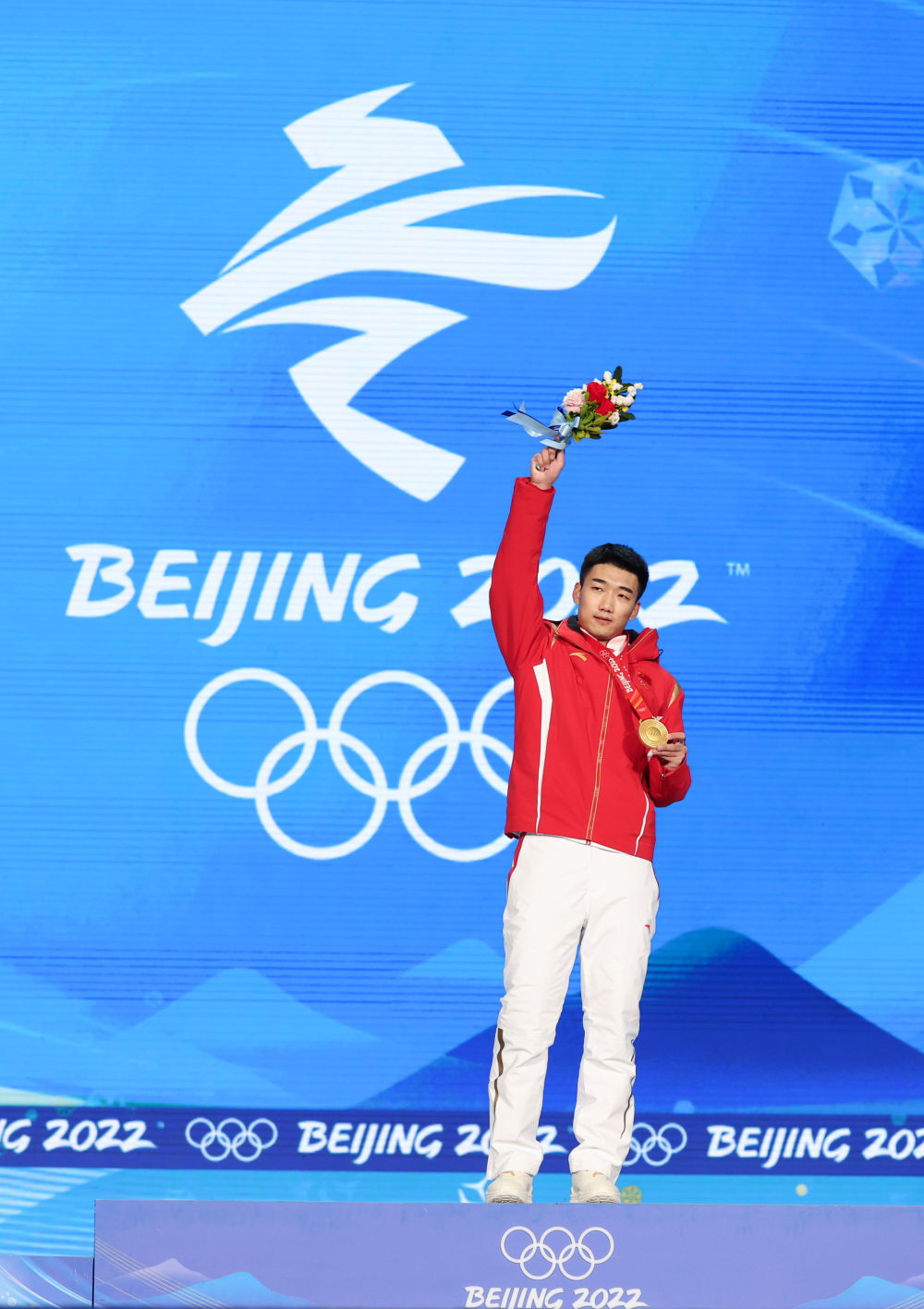 ↑2月12日,冠军中国选手高亭宇在奖牌颁发仪式上。