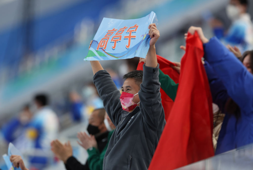 ↑2月12日,观众庆祝中国选手高亭宇夺冠。