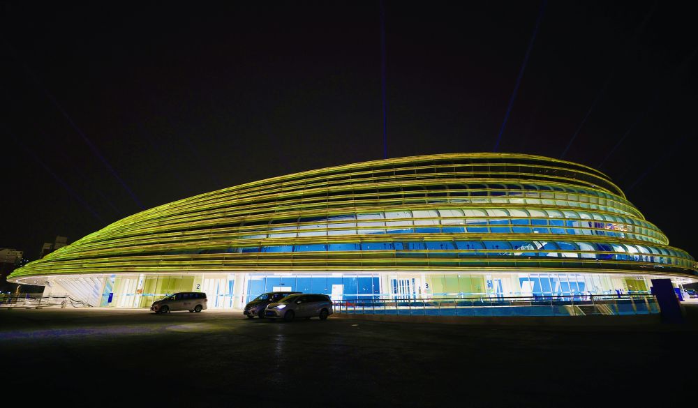 ↑2月12日晚,国家速滑馆“冰丝带”打出金色灯光秀,变身“金丝带”。