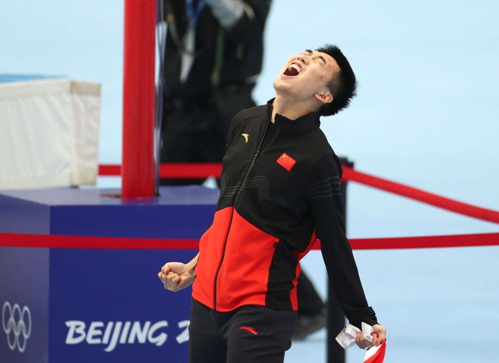 ↑2月12日,中国选手高亭宇在比赛后庆祝。