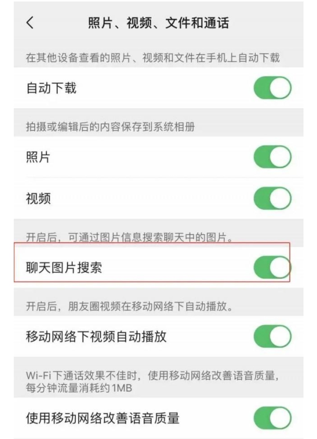 记者测试发现,用户在“设置”——“通用”——“照片、视频、文件和通话”中就可以开通该功能。开启后,比如输入“人物”关键词,就会检索到聊天中所有与人物相关的图片。