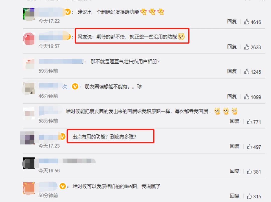 不过,也有用户觉得这个功能其实可有可无。有网友表示,该功能在普通用户的使用场景中其实并不常用,反而不如“朋友圈发原图”、“朋友圈编辑”、“好友互删”等功能重要。