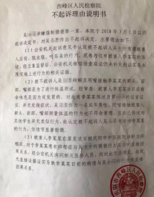 今年3月1日,在庆阳市西峰区区检察院作出不起诉吴永厚决定后,李明到庆阳市人民检察院进行申诉。5月18日,市检察院维持西峰区检察院不起诉决定。