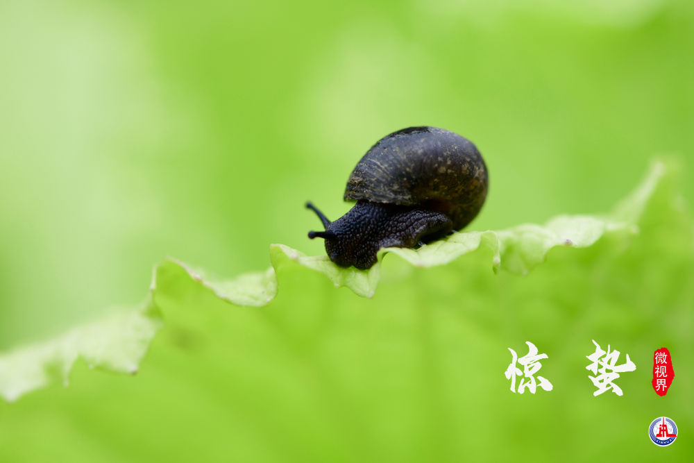 ↑山东省邹平市,一只蜗牛在菜叶上伸长触角,仿佛伸着懒腰享受春光。新华社发(高发芳 摄)