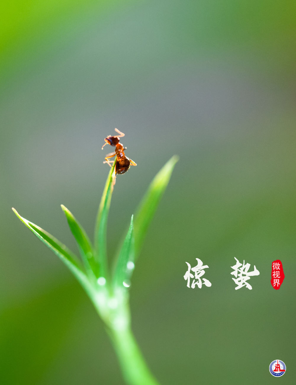 ↑山东省淄博市高青县,一只蚂蚁在春光中“登顶”叶尖。新华社发(张维堂 摄)