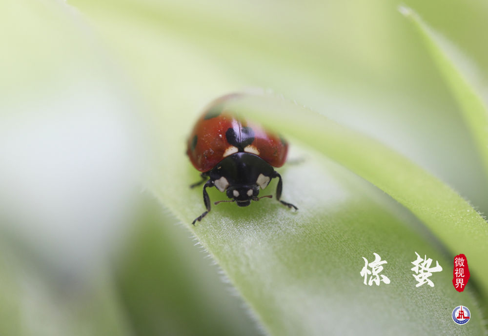 ↑河南省济源市,一只瓢虫在作物上爬行。新华社发(苗秋闹 摄)