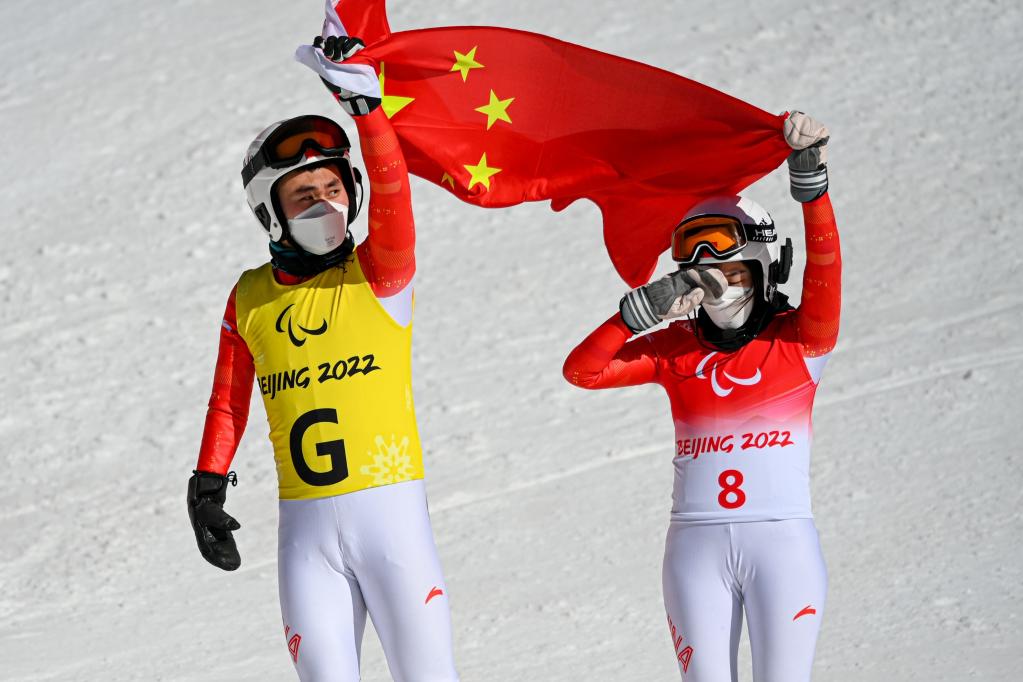 3月7日,中国选手朱大庆(右)和引导员闫寒寒在残奥高山滑雪女子全能(视障)比赛后庆祝。新华社记者江汉摄