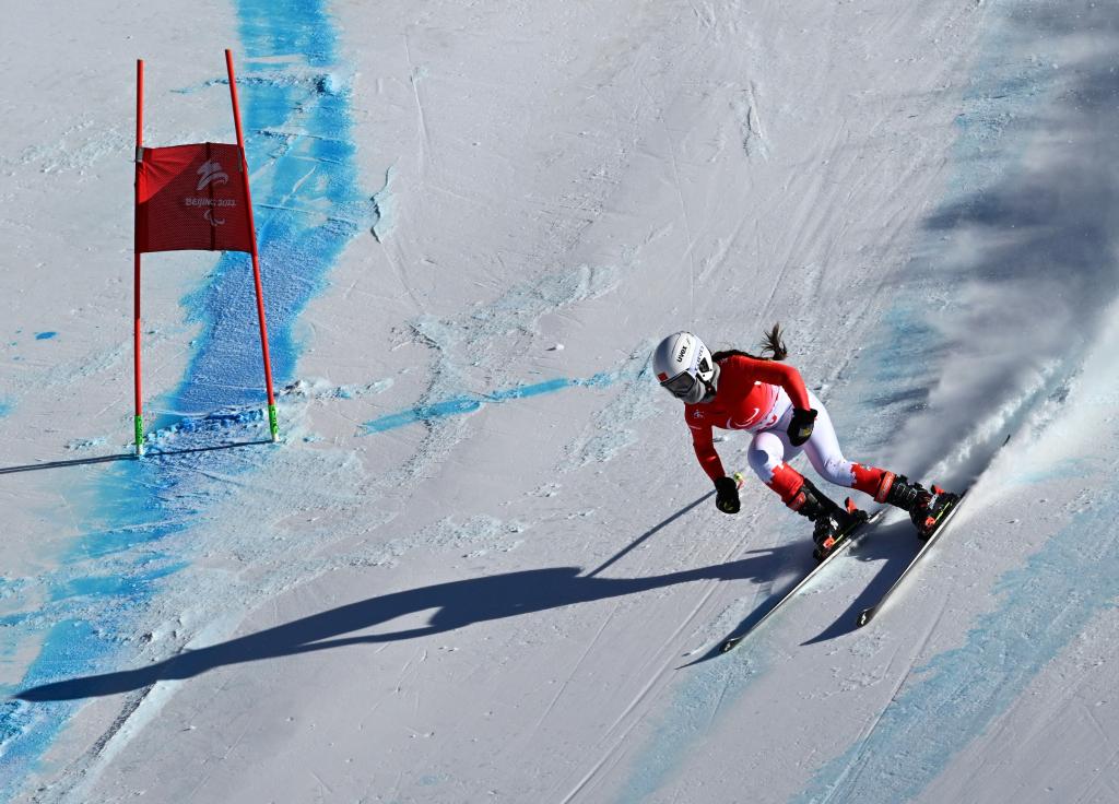 3月7日,中国选手张梦秋在残奥高山滑雪女子全能(站姿)比赛中获得亚军。 新华社记者张晨霖摄
